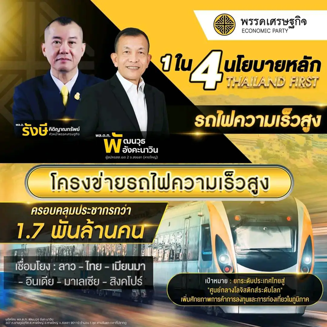 วันที่ 1 ม.ค. 2569 พล.ต.ท.พัฒนวุธ อังคะนาวิน ผู้สมัคร ส.ส.เขต 2 สงขลา (หาดใหญ่–คลองอู่ตะเภา) เปิดเผย 1 ใน 4 นโยบายหลักของพรรคเศรษฐกิจ โดยเน้นโครงการ รถไฟความเร็วสูงเชื่อม Belt and Road Initiative เพื่อยกระดับประเทศไทยสู่ศูนย์กลางโลจิสติกส์ของอาเซียน เชื่อมต่อเศรษฐกิจ เปิดประตูโอกาส และสร้างอนาคตให้คนไทยทุกคน