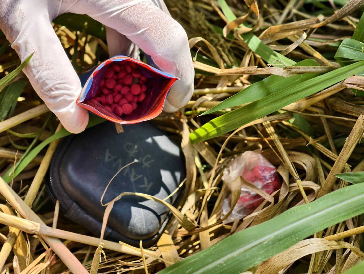 จากการตรวจสอบบริเวณตัวผู้ประสบเหตุ เจ้าหน้าที่พบสารเสพติดชนิดเม็ดบรรจุในถุงพลาสติกใสกระเด็นออกมา และภายในกระเป๋าสะพายสีดำพบถุงสีน้ำเงิน ภายในบรรจุเม็ดลักษณะต้องสงสัยประมาณ 200 กว่าเม็ด นอกจากนี้ ในกระเป๋ากางเกงด้านขวาพบปลอกกระสุนปืนขนาด .38 จำนวน 5 ปลอก แต่ไม่พบอาวุธปืนในที่เกิดเหตุ ขณะที่บริเวณเอวด้านหน้าพบมีดพกแบบเหน็บ จำนวน 1 เล่ม