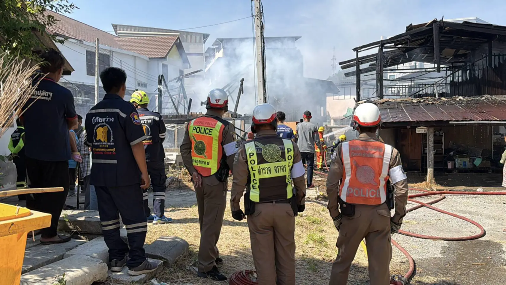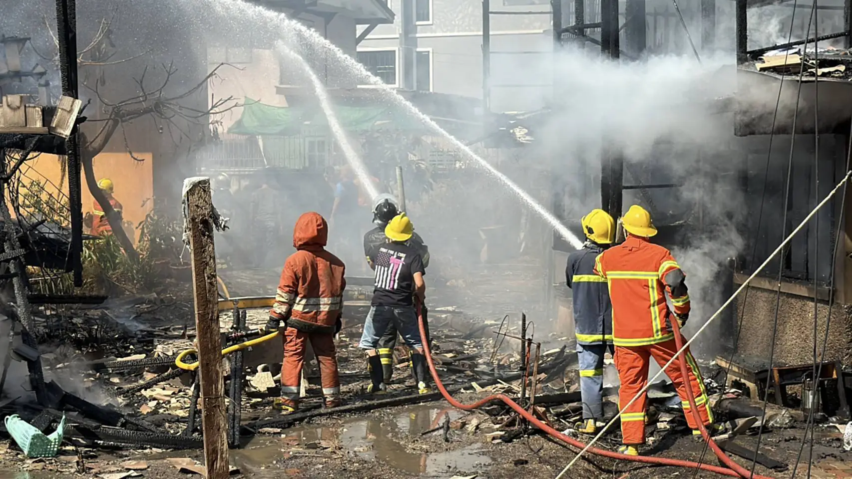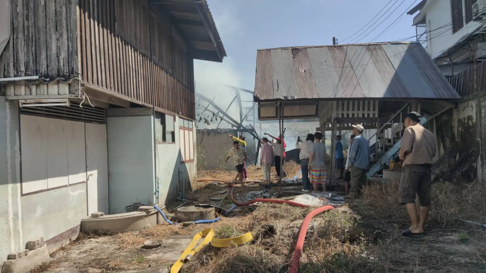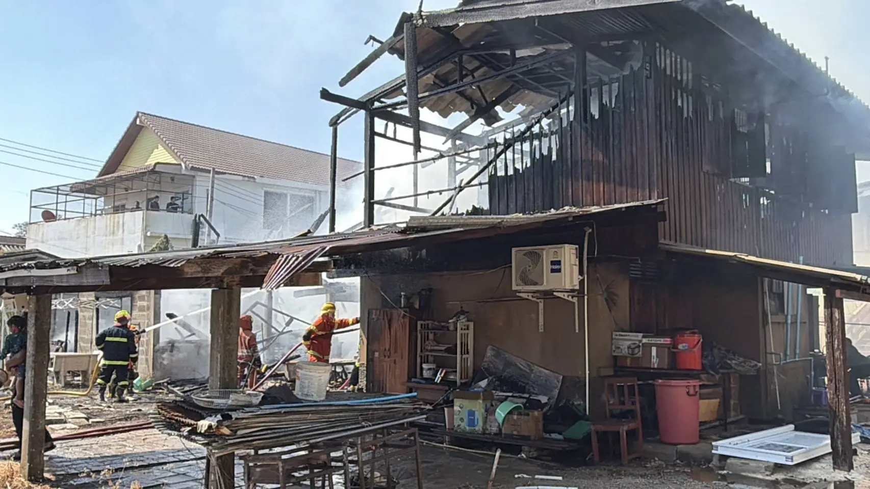 ที่เกิดเหตุเป็นบ้านไม้ 2 ชั้น จำนวน 2 หลัง ซึ่งเป็นเชื้อเพลิงชั้นดี ถูกเพลิงไหม้อย่างรุนแรง และมีควันสีดำโพยพุ่งออกมาเป็นจำนวนมาก นอกจากนี้ยังมีเสียงระเบิดดังออกมาเป็นระยะ เจ้าหน้าที่ดับเพลิง และหน่วยกู้ภัย