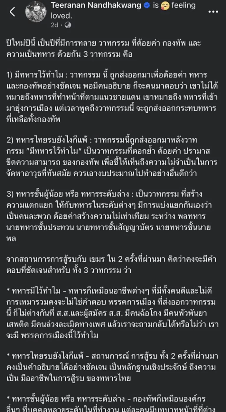 ด้วยเหตุนี้ ผมจึงรู้สึกแปลกใจอย่างยิ่งว่า เกิดอะไรขึ้นกับพี่โอ๋ พล.ท.ธีรนันท์ นันทขว้าง เจ้ากรมข่าวทหารบก ที่ออกมาโพสต์ข้อความในลักษณะด้อยค่าพรรคการเมือง ซึ่งใครๆ ก็ดูออกว่าหมายถึงพรรคประชาชน