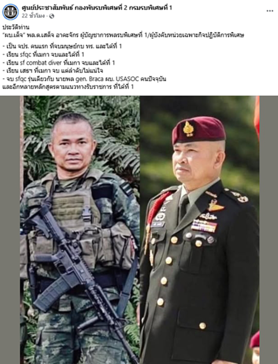 นอกจากนี้เพจเฟซบุ๊ก SMART Soldiers l Lead by example ยังได้โพสต์ข้อความด้วยว่า “ผบ.เด็จ” พล.ต.เสด็จ อาคะจักรผู้บัญชาการพลรบพิเศษที่ 1ผู้บังคับหน่วยเฉพาะกิจปฏิบัติการพิเศษ