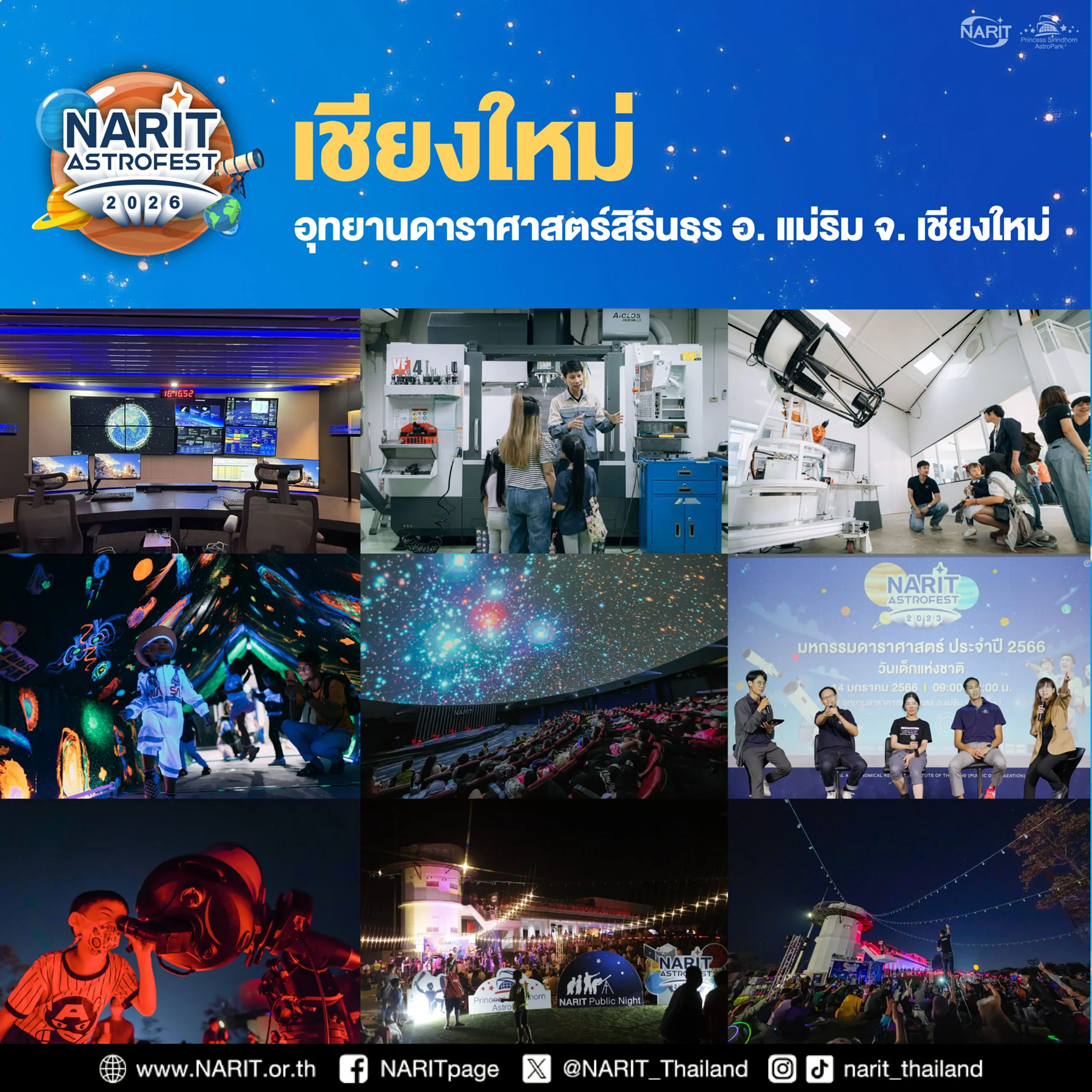 อุทยาดาราศาสตร์สิรินธร อ. แม่ริม จ. เชียงใหม่ : หนึ่งปีมีครั้งเดียวกับกิจกรรม Open House เปิดห้องปฏิบัติการเทคโนโลยีดาราศาสตร์และวิศวกรรมขั้นสูงสุดล้ำ ครั้งแรก! ที่จะเปิดให้ชม “ห้องควบคุมสถานีภาคพื้นดิน” สำหรับภารกิจดาวเทียมไทย เกาะติดภารกิจฉางเอ๋อ 7 กับ “อุปกรณ์ Payload ไทย ที่จะไปโคจรรอบดวงจันทร์” พบกับนวัตกรรมใหม่ล่าสุด “หุ่นยนต์กล้องโทรทรรศน์ 0.8 เมตร” ฝีมือคนไทย กระทบไหล่นักดาราศาสตร์ตัวจริงกับบูธงานวิจัยดาราศาสตร์หลากหลายสาขา และกิจกรรมดาราศาสตร์จัดเต็มสำหรับเด็กและครอบครัว พิเศษ! พบกับ 2 Special Talk เฉพาะที่เชียงใหม่ เอาใจคอหนัง กับ “Space on Film: ภาพยนตร์พาเราเข้าใกล้อวกาศจริงแค่ไหน” เปิดเวทีพูดคุยผ่านมุมมองผู้กำกับและนักวิชาการทางดาราศาสตร์ ร่วมถอดรหัสฉากในภาพยนตร์ชื่อดังสู่ข้อเท็จจริงทางฟิสิกส์ และอวกาศ ปลุกแรงบันดาลใจกันต่อกับ “From Dream to NARIT: ฝันอย่างไรให้ถึงจักรวาล” ล้อมวงฟังเรื่องราวแรงบันดาลใจของนักดาราศาสตร์และวิศวกร NARIT เบื้องหลังเส้นทางสู่สายอาชีพในองค์กรดาราศาสตร์ระดับประเทศ พร้อมอิ่มอร่อยตลอดทั้งวันกับ Star Market สารพันสินค้าอาหารในธีมดวงดาว ช่วงค่ำชวนมานั่งปิกนิกชมดาวเคล้าลมหนา