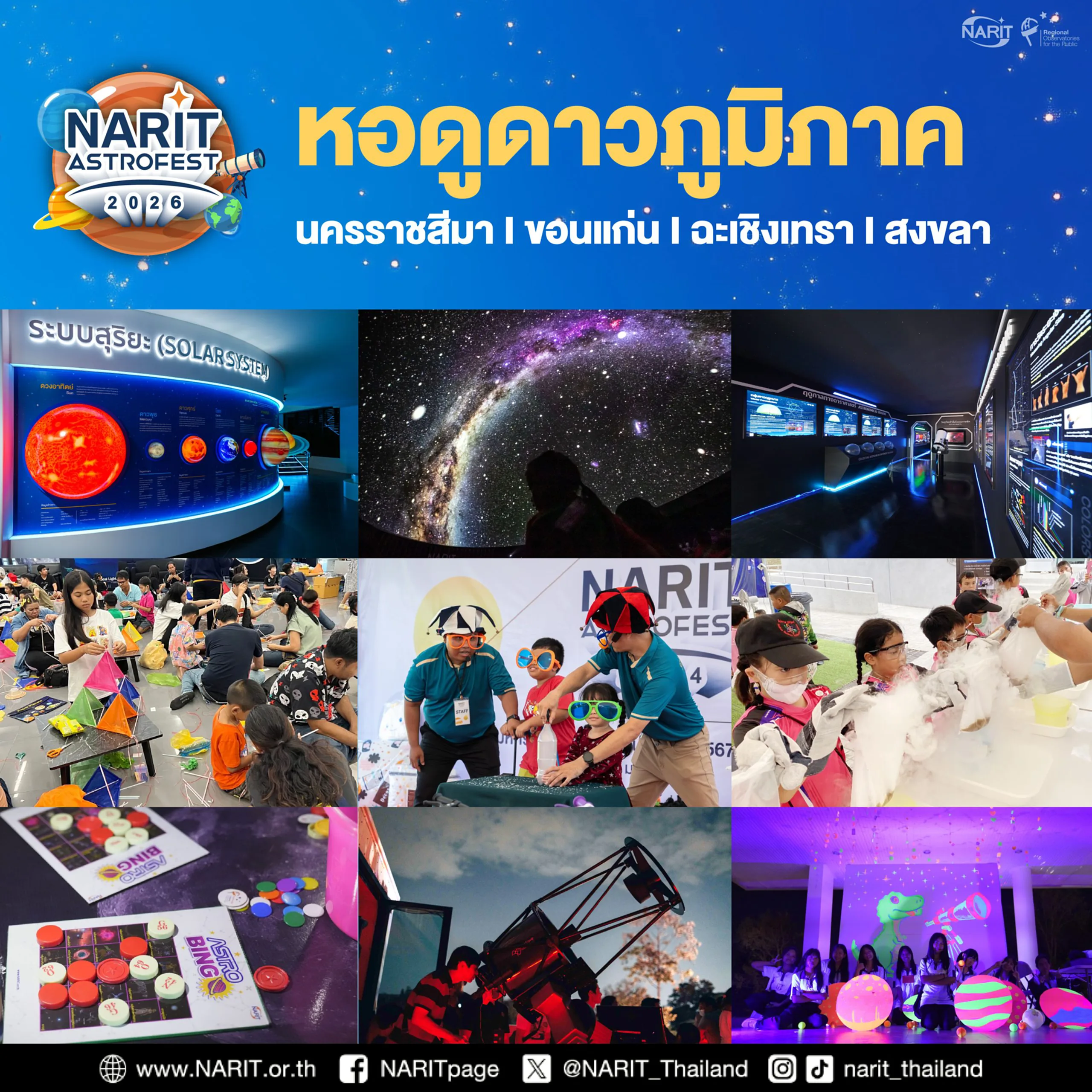 สถาบันวิจัยดาราศาสตร์แห่งชาติ (องค์การมหาชน) (สดร. หรือ NARIT) กระทรวงการอุดมศึกษา วิทยาศาสตร์ วิจัย และนวัตกรรม (อว.) ชวนเที่ยวงาน “NARIT AstroFest 2026” มหกรรมดาราศาสตร์สุดยิ่งใหญ่ในวันเด็กแห่งชาติ คืนดาวพฤหัสบดีใกล้โลกที่สุดในรอบปี วันเสาร์ที่ 10 มกราคม 2569 จัดใหญ่ จัดเต็มพร้อมกัน 5 แห่งทั่วประเทศ ณ อุทยานดาราศาสตร์สิรินธร เชียงใหม่ และหอดูดาวภูมิภาค นครราชสีมา ขอนแก่น ฉะเชิงเทรา และสงขลา เรียนรู้และสนุกกับหลากหลายกิจกรรมดาราศาสตร์ตลอดทั้งวัน ต่อด้วยกิจกรรมดูดาวในช่วงกลางคืน ตั้งแต่เวลา 09:00 – 22:00 น. เข้าร่วมฟรี ไม่มีค่าใช้จ่าย