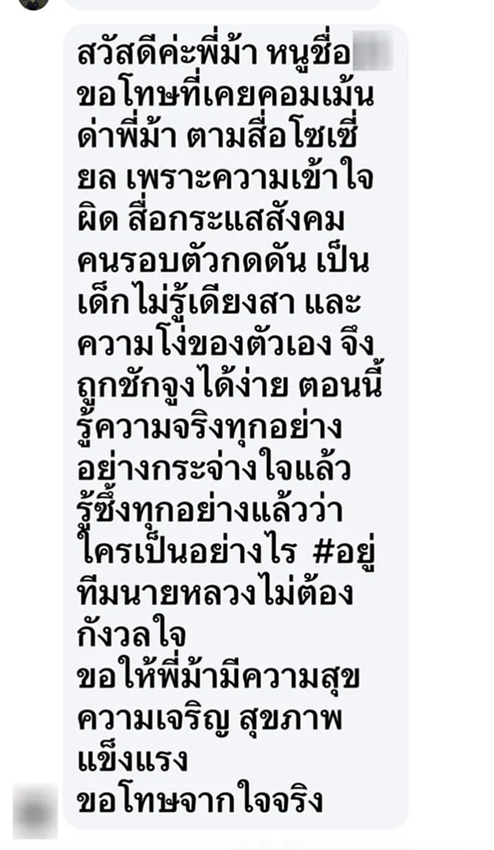 สำหรับข้อความจากชาวเน็ตคนดังกล่าว ระบุว่า “สวัสดีค่ะพี่ม้า หนูชื่อ… ขอโทษที่เคยคอมเมนต์ด่าพี่ม้า ตามสื่อโซเชียล เพราะความเข้าใจผิด สื่อกระแสสังคม คนรอบตัวกดดัน เป็นเด็กไม่รู้เดียงสา และความโง่ของตัวเอง ตอนนี้รู้ความจริงทุกอย่างกระจ่างใจแล้ว รู้ซึ้งทุกอย่างแล้วว่าใครเป็นอย่างไร #อยู่ทีมนายหลวง ไม่ต้องกังวลใจ ขอให้พี่ม้ามีความสุข ความเจริญ สุขภาพแข็งแรง ขอโทษจากใจจริง”
