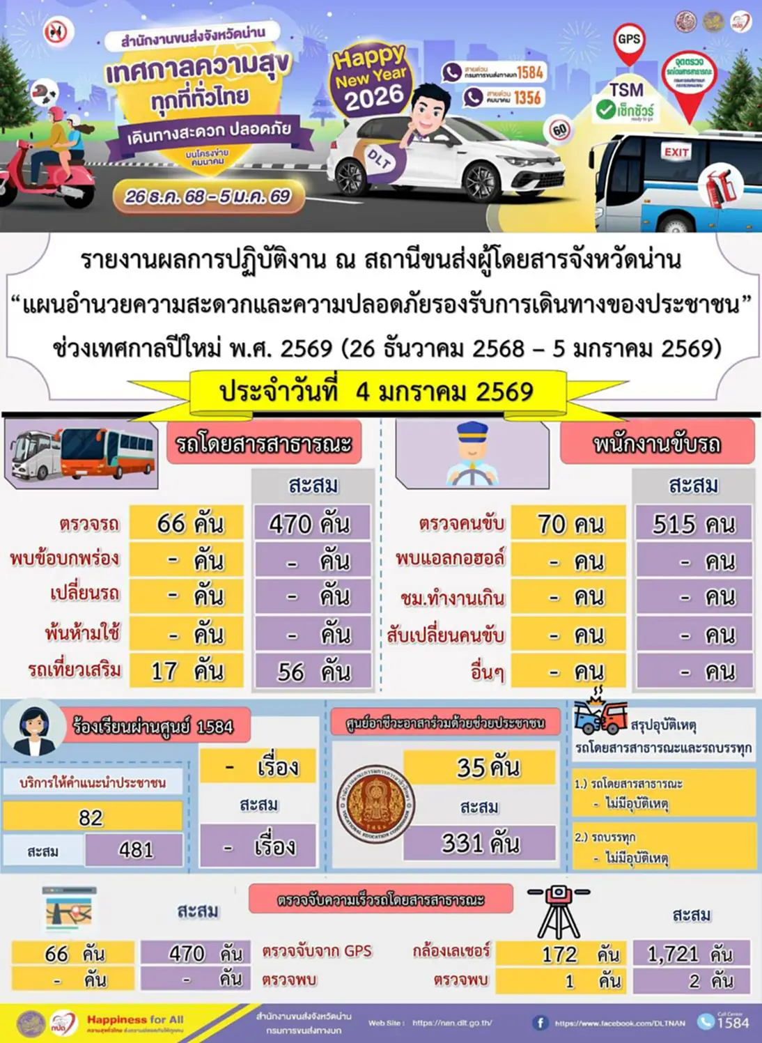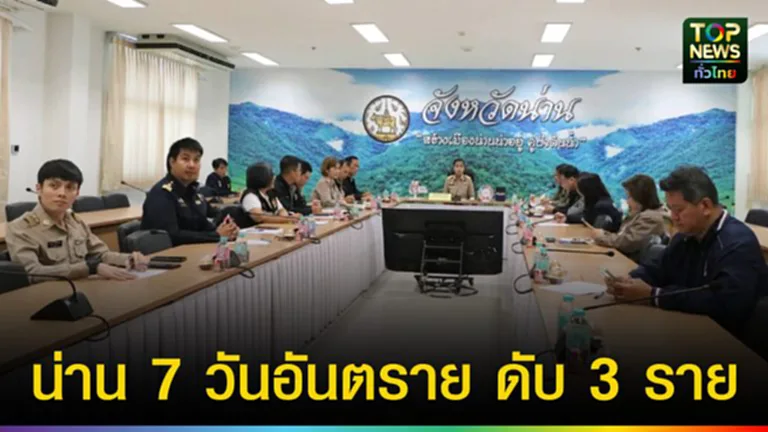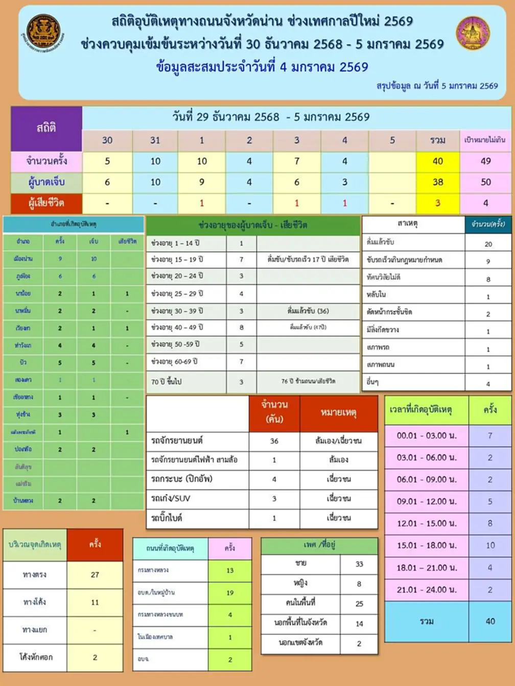 ที่ประชุมรายงานว่า ตลอดช่วงควบคุมเข้มข้น 7 วัน จังหวัดน่านเกิดอุบัติเหตุทางถนนสะสมจำนวน 40 ครั้ง มีผู้ได้รับบาดเจ็บ 38 ราย และมีผู้เสียชีวิต 3 ราย โดยสถิติประจำวันวันที่ 4 มกราคม 2569 เกิดอุบัติเหตุ 4 ครั้ง มีผู้บาดเจ็บ 3 ราย และเสียชีวิต 1 ราย