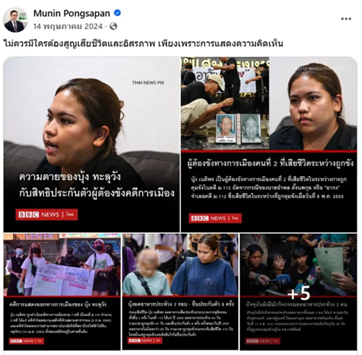 *14 พฤษภาคม 2564 รศ.ดร.มุนินทร์ โพสต์เฟซบุ๊กถึงการเสียชีวิตของบุ้ง ทะลุวังว่า ไม่ควรมีใครต้องสูญเสียชีวิตและอิสรภาพ เพียงเพราะการแสดงความคิดเห็น