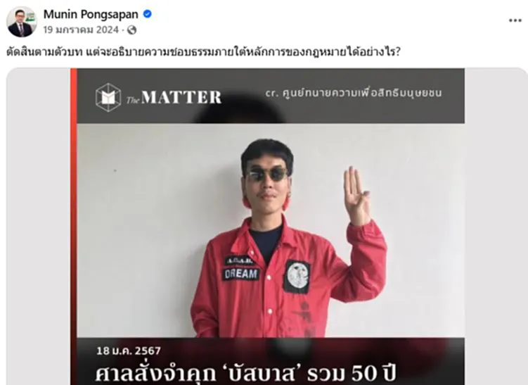 *19 มกราคม 2567 รศ.ดร.มุนินทร์ โพสต์เฟซบุ๊กถึงกรณีศาลพิพากษาจำคุก “บัสบาส” แนวร่วมม็อบ 3 นิ้ว รวม 50 ปีในคดีโพสต์หมิ่น 112 ถึง 27 ข้อความว่า ตัดสินตามตัวบท แต่จะอธิบายความชอบธรรมภายใต้หลักการของกฎหมายได้อย่างไร?