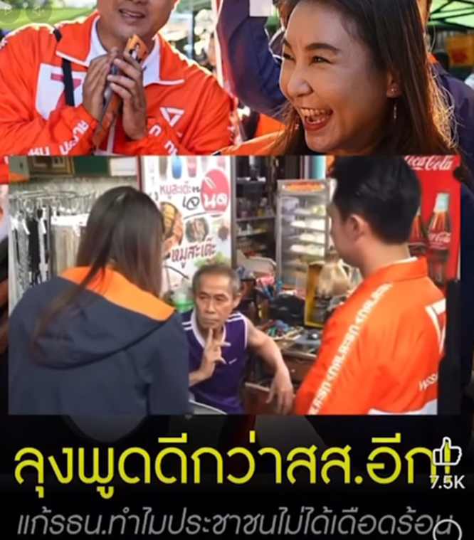 โดยนายชูวิทย์ ระบุว่า พรรคส้มเป็นพรรคที่ขยันขันแข็ง มีพลังเหลือเฟือในการหาเสียง ไม่ว่าเวทีปราศรัย หรือเดินเท้าตามตลาด พรรคอื่นขยันสู้ไม่ได้ บางพรรคหายไปด้วยซ้ำ แต่ความขยันลงพื้นที่ ทำให้ต้องไปเจอชาวบ้านไถ่ถามมาก ถึงสิ่งที่คนหนุ่มสาวของพรรคส้มจะทำ เมื่อไหม สิริกัญญา ตันสกุล เดินหาเสียงตามตลาด จึงเจอคำถามซื่อๆ ง่ายๆ ของลุงร้านกรอบพระที่ถามว่า “ทำไมไม่แก้ปัญหาปากท้อง มัวแต่จะแก้รัฐธรรมนูญ?”