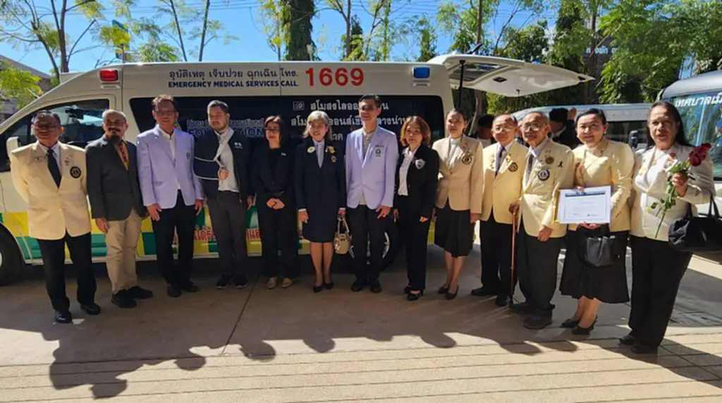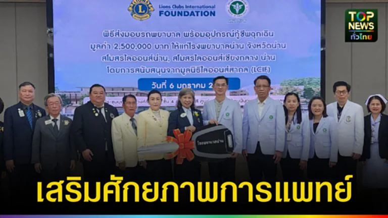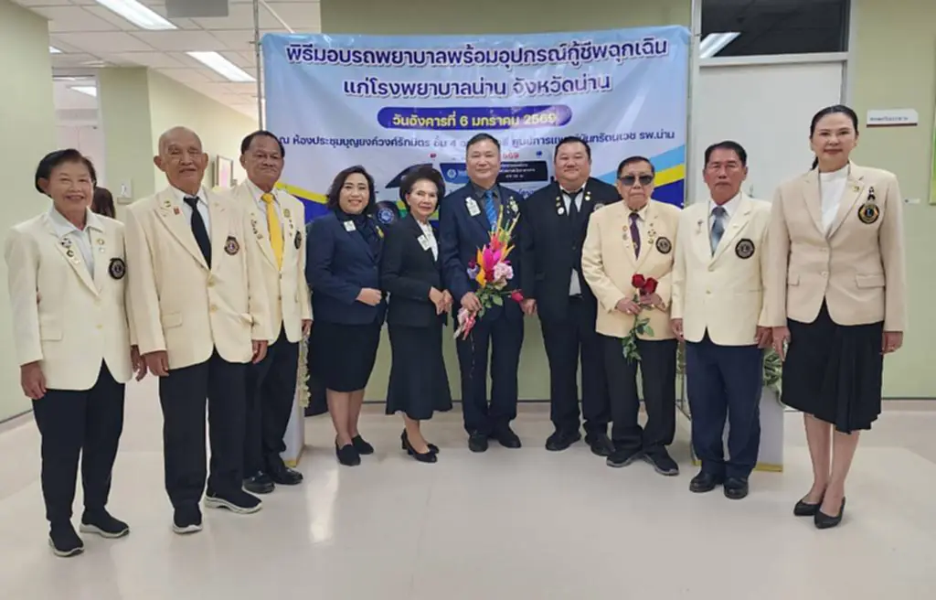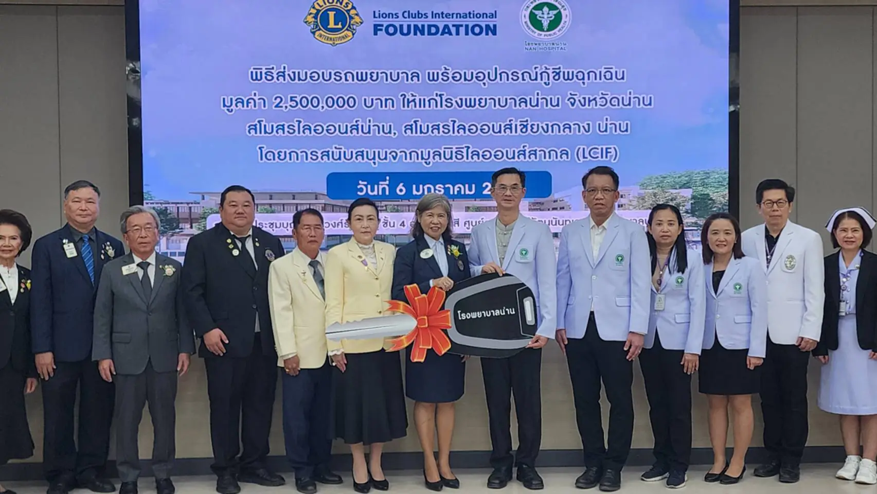 เมื่อวันที่ 6 มกราคม 2569 เวลา 10.30 น.ณ ห้องประชุมบุญยงค์ วงศ์รักมิตร ชั้น 4 อาคารรังสี ศูนย์การแพทย์รัตนนันทเวช โรงพยาบาลน่าน อำเภอเมืองน่าน จังหวัดน่าน สโมสรไลออนส์น่าน ร่วมกับสโมสรไลออนส์เชียงกลาง น่าน จัดพิธีมอบรถพยาบาลพร้อมอุปกรณ์กู้ชีพฉุกเฉิน มูลค่า 2,500,000 บาท ให้แก่โรงพยาบาลน่าน โดยได้รับการสนับสนุนงบประมาณจากมูลนิธิไลออนส์สากล (Lions Clubs International Foundation : LCIF)