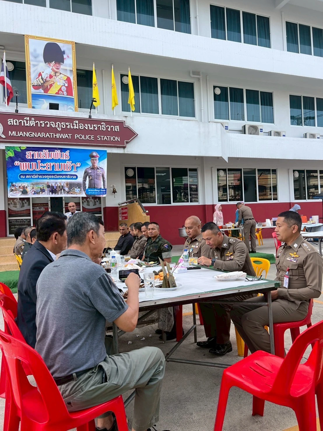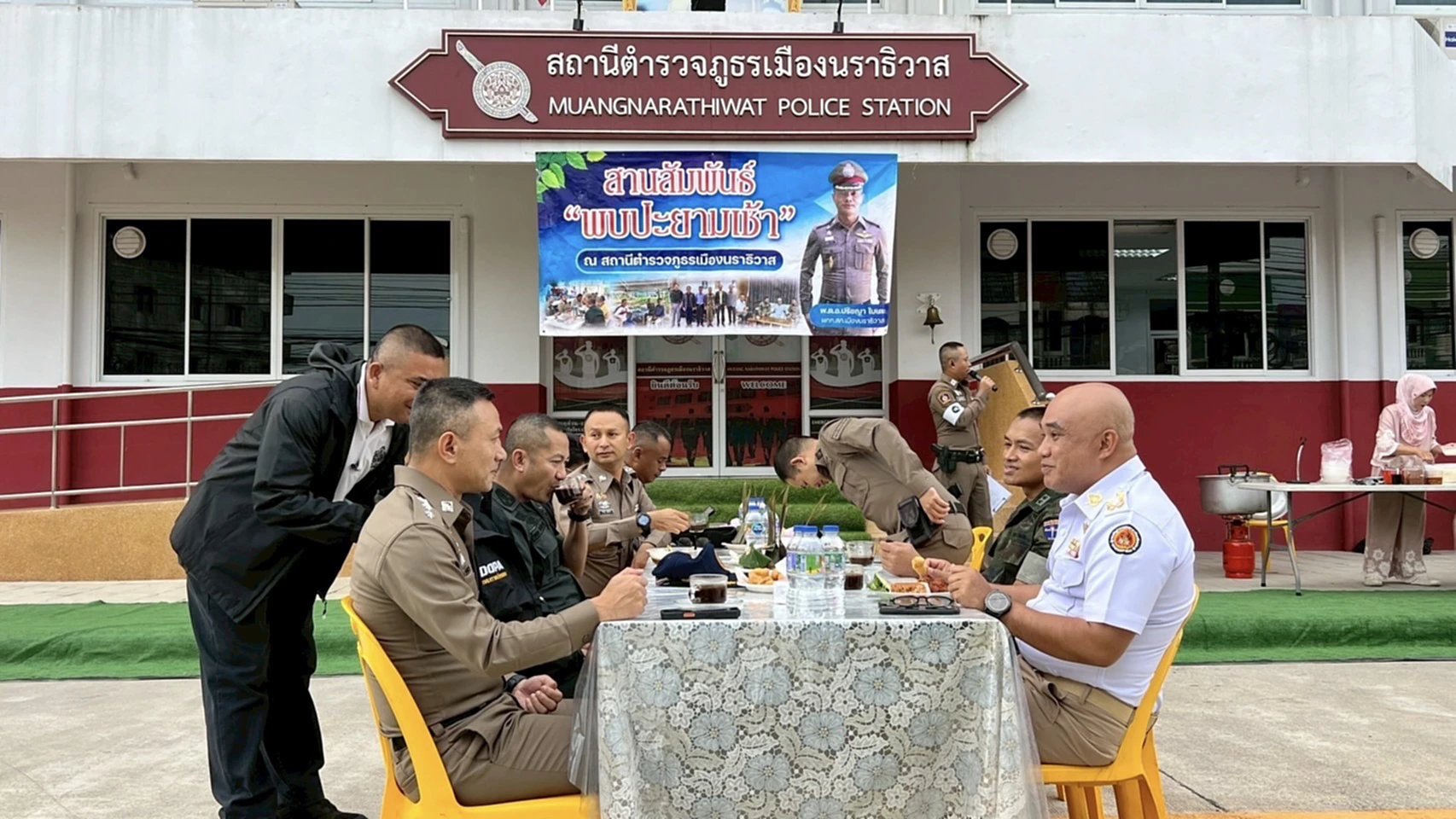 วันที่ 6 ม.ค. 2569 พ.ต.อ.ปรัชญา ไบเตะ ผกก.สภ.เมืองนราธิวาส เปิดโรงพักต้อนรับหน่วยงานด้านความมั่นคง อาทิ ฝ่ายปกครองอำเภอเมืองนราธิวาส หน่วยเฉพาะกิจนาวิกโยธินภาคใต้ และหน่วยเฉพาะกิจตำรวจนราธิวาสที่ 93 ในกิจกรรมสานสัมพันธ์พบปะยามเช้า ณ บริเวณหน้าที่ทำการ สภ.เมืองนราธิวาส อ.เมือง จ.นราธิวาส เพื่อเป็นเวทีพบปะพูดคุย สร้างความสัมพันธ์อันดีระหว่างส่วนราชการ หลังจากร่วมผนึกกำลังปฏิบัติภารกิจวางกำลังรักษาความปลอดภัยในพื้นที่อย่างเข้มข้น ทั้งช่วงก่อนเทศกาลและระหว่างการคุมเข้ม “7 วันอันตราย” เทศกาลปีใหม่ 2569