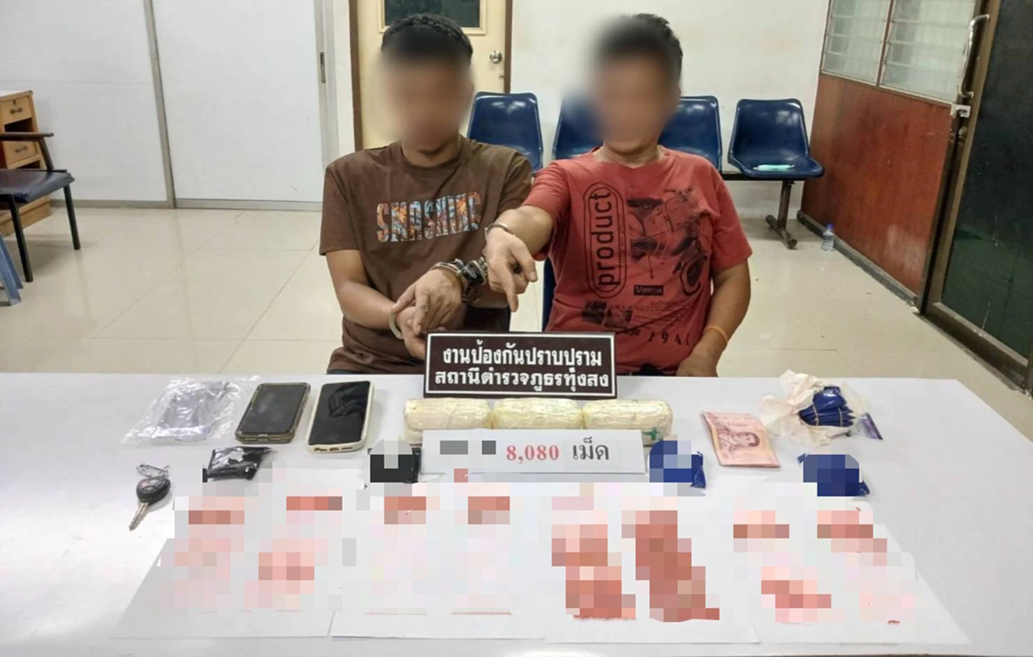 เจ้าหน้าที่จึงปิดล้อมรถขอตรวจค้น ระหว่างนั้นนายธีรภพ นั่งเบาะข้างคนขับในลักษณะเอนเบาะนอน ท่าทางมีพิรุธออกอาการสั่นกลัว เหงื่อท่วม พูดจาตะกุดตะกัด อย่างเห็นได้ชัด แต่ช่วงแรก ผู้ต้องสงสัยทั้ง 2 ราย ไม่ยอมเปิดประตูรถให้ตรวจค้น ส่วนในมือนายมณี ถือผ้าห่มสีขาวพันทับสิ่งของบางอย่างอยู่ตลอด สุดท้ายถูกเจ้าหน้าที่กดดันอย่างหนัก จึงยอมเปิดประตูลงจากรถ แต่ปรากฏเมื่อผู้ต้องหาทั้งสอง ลงจากรถ นายมณี คนขับ ผลักอกเจ้าหน้าที่จนล้ม แล้วพยายามวิ่งหนีไปท้ายรถกระบะ แต่ถูกเจ้าหน้าอีกรายกระชากเสื้อไว้ได้ ก่อนจะกอครัดฟัดเหวี่ยงอยู่ครู่หนึ่ง ระหว่างนันสิ่งของที่อยู่ในมือนายมณี ตกหล่นข้างรถ พบว่ากระดาษสาสีขาวมีตราประทับเป็นรูปกางเขนสีเขียวจำนวน 4 ก้อน ตรวจสอบเป็นยาบ้าจำนวน 8,050 เม็ด จึงคุมตัวสอบสวนให้การรับสารภาพว่า เป็นนักบิน เท่านั้น ทำหน้าที่ส่งยาให้ลูกค้า โดยได้รับค่าจ้างเป็นเที่ยวๆ จึงคุมตัวผู้ต้องหาทั้ง 2 ราย พร้อมของกลาง สอบสวนขยายผลและดำเนินคดีตามกฎหมายต่อไป
