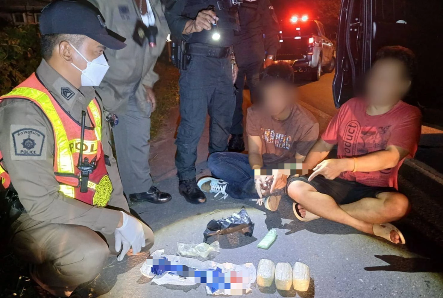 เมื่อถึงจุดตรวจจุดสกัด รถกระบะต้องสงสัยพยายามขับผ่าจุดตรวจจุดสกัด เจ้าหน้าที่จึงใช้รถจักรยานยนต์ตราโล่ 2 คัน ประกบรถกระบะต้องสงสัย โดยมีรถยนต์ของเจ้าหน้าที่ปิดท้ายรถกระบะต้องสงสัย ก่อนจะปิดการจราจร เพื่อสกัดรถกระบะต้องสงสัย พบคนขับทราบชื่อนายมณี อายุ 41 ปี ส่วนผู้โดยสารอีกรายชื่อนายธีรภพ อายุ 26 ปี