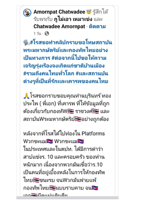 ถึงเราอยู่เมืองนอก ก็ดูแลประเทศได้ โดยให้ข้อมูลที่ถูกต้องกับน้องๆ หนูๆ ใครฟังข่าวแล้วไปเข้าข้างเขมร เราก็ใช้ความสามารถที่รู้ภาษาอังกฤษอธิบายเขาได้ ตรงนี้เราภูมิใจมาก ปีใหม่แล้ว สิ่งที่พระมหากษัตริย์ไทย และกองทัพไทยทำให้ประชาชนแฮปปี้ที่สุด คือเราได้ชัยชนะจากเขมร วันที่เห็นทหารเอาธงชาติขึ้นปราสาท โรสดูแล้วร้องไห้เลย (ร้องไห้) โรสภูมิใจมากที่เกิดเป็นคนไทย มีสายเลือดไทย (ร้องไห้) เรามีลูกสาวก็บอกลูกว่าเราภาคภูมิใจที่เราเป็นคนไทย เราก็จะทำแบบนี้ต่อไปเรื่อยๆ จนกว่าประชาชนคนไทยที่เคยเกลียดเจ้า เคยหลงผิด กลับมาเข้าใจสถาบัน”