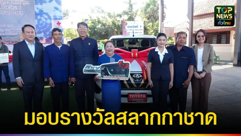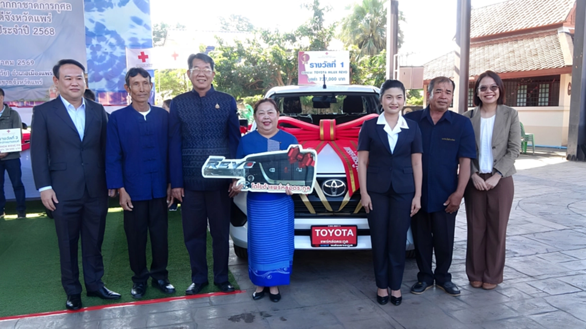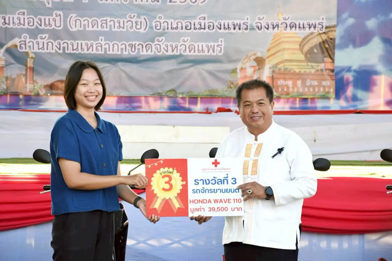 วันที่ 7 มกราคม 2569 ที่บริเวณข่วงวัฒนธรรมเมืองแป้ อำเภอเมืองแพร่ นายสมชัย เลิศประสิทธิพันธ์ ผู้ว่าราชการจังหวัดแพร่ พร้อมด้วยนางสาวฐิติมา สุภาพันธ์ นายกเหล่ากาชาดจังหวัดแพร่ หัวหน้าส่วนราชการ และผู้เกี่ยวข้อง ร่วมแสดงความยินดีและมอบรางวัลแก่ผู้โชคดีจากการออกสลากกาชาดการกุศลจังหวัดแพร่ ประจำปี 2568 สำหรับรางวัลที่ 1 เป็นรถยนต์กระบะ 4 ประตู TOYOTA Hilux Revo Z Edition Double Cab เกียร์ธรรมดา สีขาว จำนวน 1 รางวัล ผู้ถูกรางวัล ได้แก่ นางพรรณี เขื่อนเพชร ผู้ใหญ่บ้านหมู่ที่ 10 ตำบลเวียงทอง อำเภอสูงเม่น จังหวัดแพร่ หมายเลขสลากที่ถูกรางวัล 47114 รางวัลที่ 2 เป็นรถยนต์เก๋ง Mitsubishi เกียร์อัตโนมัติ สีเทา จำนวน 1 รางวัล และรางวัลที่ 3 รถจักรยานยนต์ Honda Wave สตาร์ทเท้า จำนวน 10 รางวัล