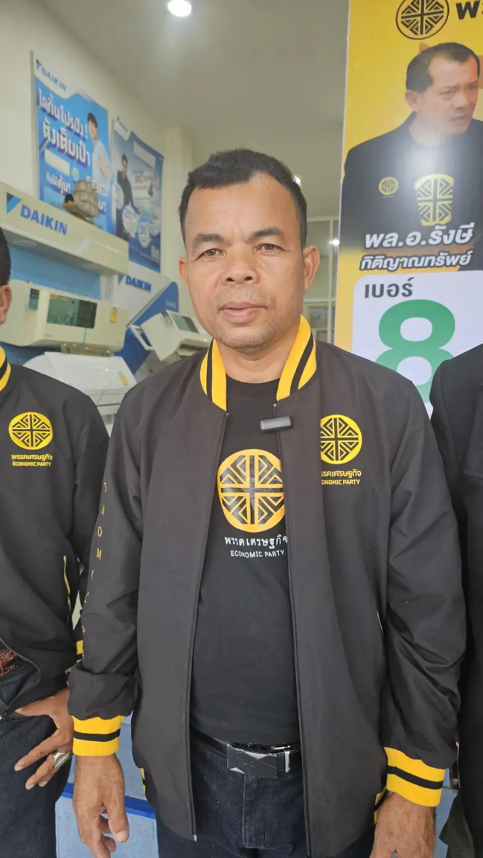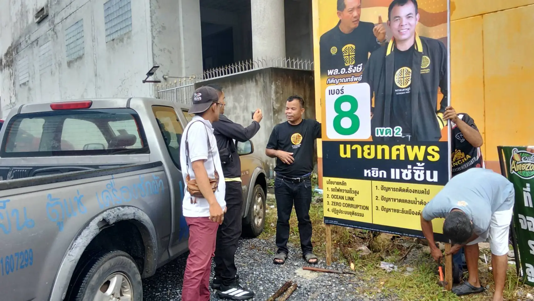 ผู้สื่อข่าวรายงานเพิ่มเติมว่า ระหว่างลงพื้นที่ติดตามการหาเสียงในย่านตลาด 100 ปี พบการติดตั้งป้ายหาเสียงของพรรคเศรษฐกิจ โดยหนึ่งในผู้ร่วมติดตั้งป้ายคือ นายทศพร หยิกแซ่ซิ้น ผู้สมัคร ส.ส. เขต 2 เบอร์ 8 พรรคเศรษฐกิจ ซึ่งลงมือดำเนินการด้วยตนเองร่วมกับทีมงาน นายทศพร เปิดเผยว่า เลือกติดตั้งป้ายหาเสียงเองทุกจุด เพื่อให้ได้ตำแหน่งที่มองเห็นชัดเจน ไม่สร้างความเดือดร้อนแก่ประชาชน และยังช่วยประหยัดค่าใช้จ่ายในการหาเสียงอีกด้วย.