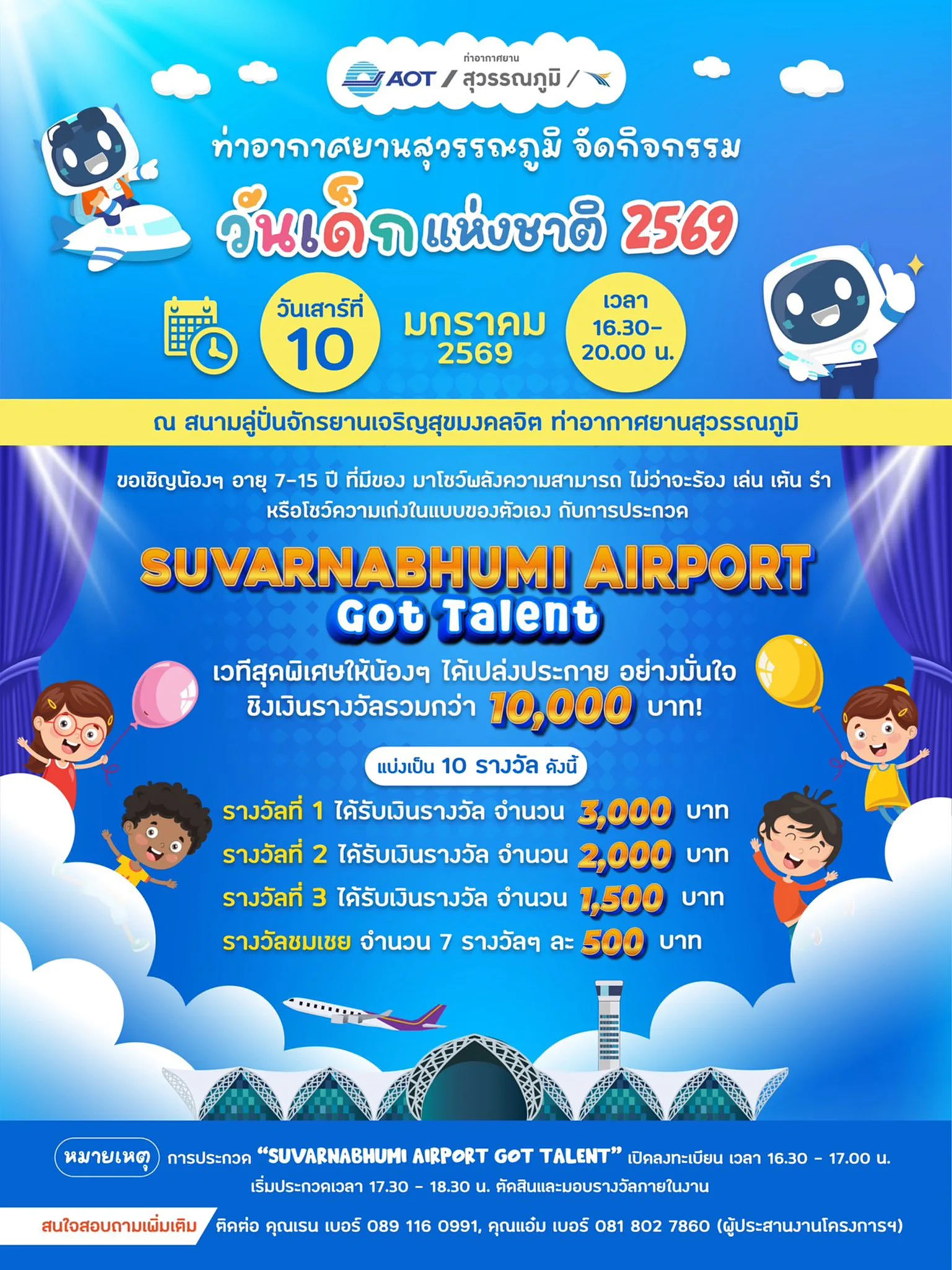 ท่าอากาศยานสุวรรณภูมิ (ทสภ.) ร่วมกับหน่วยงานพันธมิตร ขอเชิญชวนผู้ปกครองพาบุตรหลานเด็ก เยาวชนและครอบครัวในชุมชนเข้าร่วมกิจกรรมวันเด็กแห่งชาติ ประจำปี 2569 ภายในงานพบกับบูธกิจกรรมของ ทสภ. เด็กๆ จะได้เพลิดเพลินกับเกมแสนสนุก กิจกรรมเสริมจินตนาการ พร้อมรับของรางวัลและของที่ระลึกสุดพิเศษ จัดขึ้น 2 วัน 2 สถานที่ เพื่อให้เด็กๆ ได้มีส่วนร่วมอย่างทั่วถึง ดังนี้