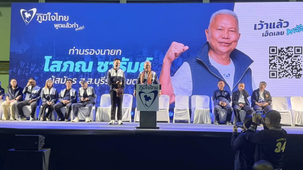 วันที่ 8 มกราคม 2569 บรรยากาศการเมืองในจังหวัดมหาสารคามเริ่มคึกคัก เมื่อวันนี้ (8 ม.ค. 2569) นายโสภณ ซารัมย์ รองนายกรัฐมนตรี และแกนนำพรรคภูมิใจไทย นายธนกร วังบุญคงชนะ รัฐมนตรีว่าการกระทรวงอุตสาหกรรม และผู้สมัคร ส.ส.บัญชีรายชื่อ พรรคภูมิใจไทย ลงพื้นที่เดินสายพบปะพี่น้องประชาชน พร้อมขึ้นเวทีปราศรัยช่วยผู้สมัคร ส.ส.ของพรรคใน 5 จุดสำคัญ ได้แก่ อ.นาเชือก และ อ.บรบือ เขตเลือกตั้งที่ 4 เพื่อหนุน นายวิเชียร จงชูวณิชย์, พื้นที่ อ.แกดำ เขต 2 เพื่อช่วย นายประวัติ ทองสมบูรณ์, พื้นที่ อ.เมืองมหาสารคาม เพื่อช่วย นายฤทธิรงค์ ภูมิสวัสดิ์ ผู้สมัคร ส.ส.เขต 1 และปิดท้ายที่ อ.เชียงยืน เพื่อหนุน นางคมคาย อุดรพิมพ์ ผู้สมัคร ส.ส.ของพรรค