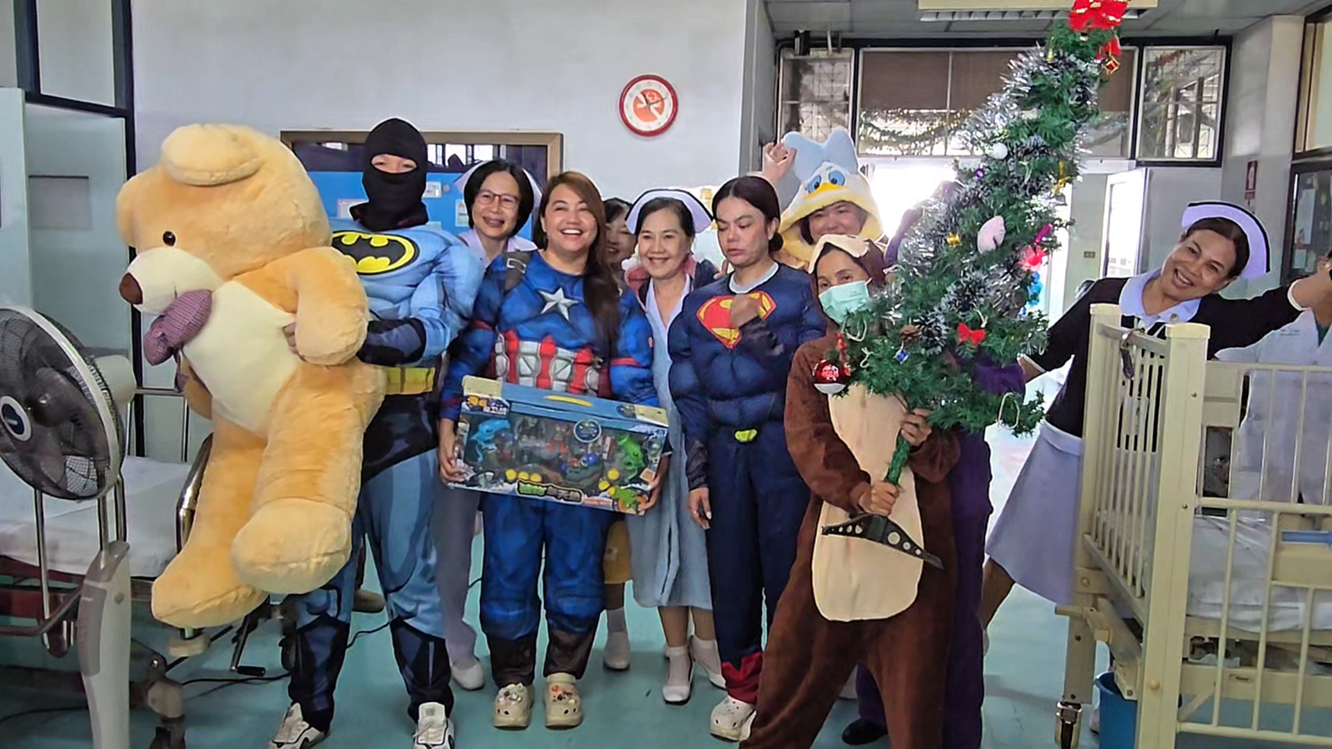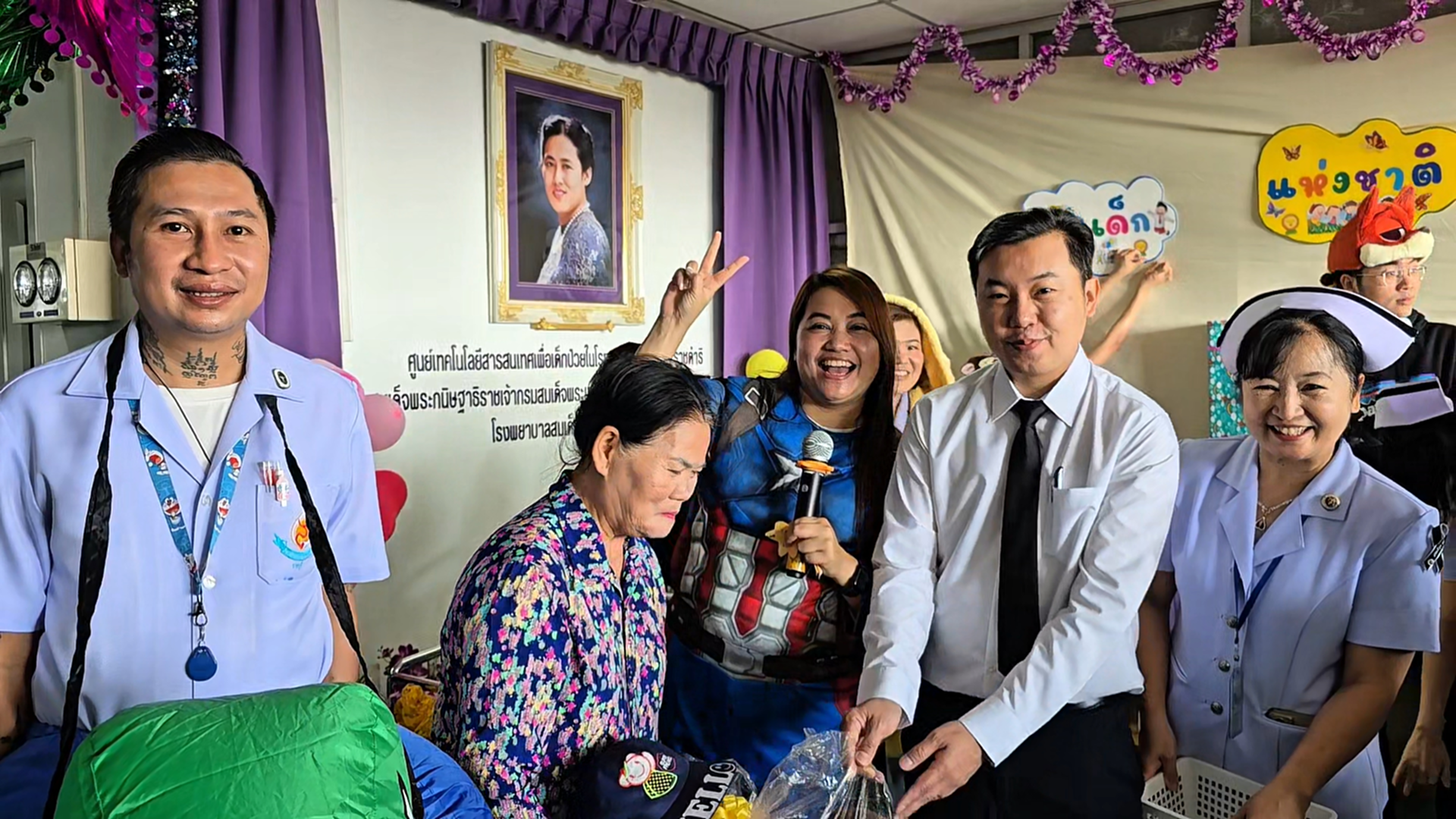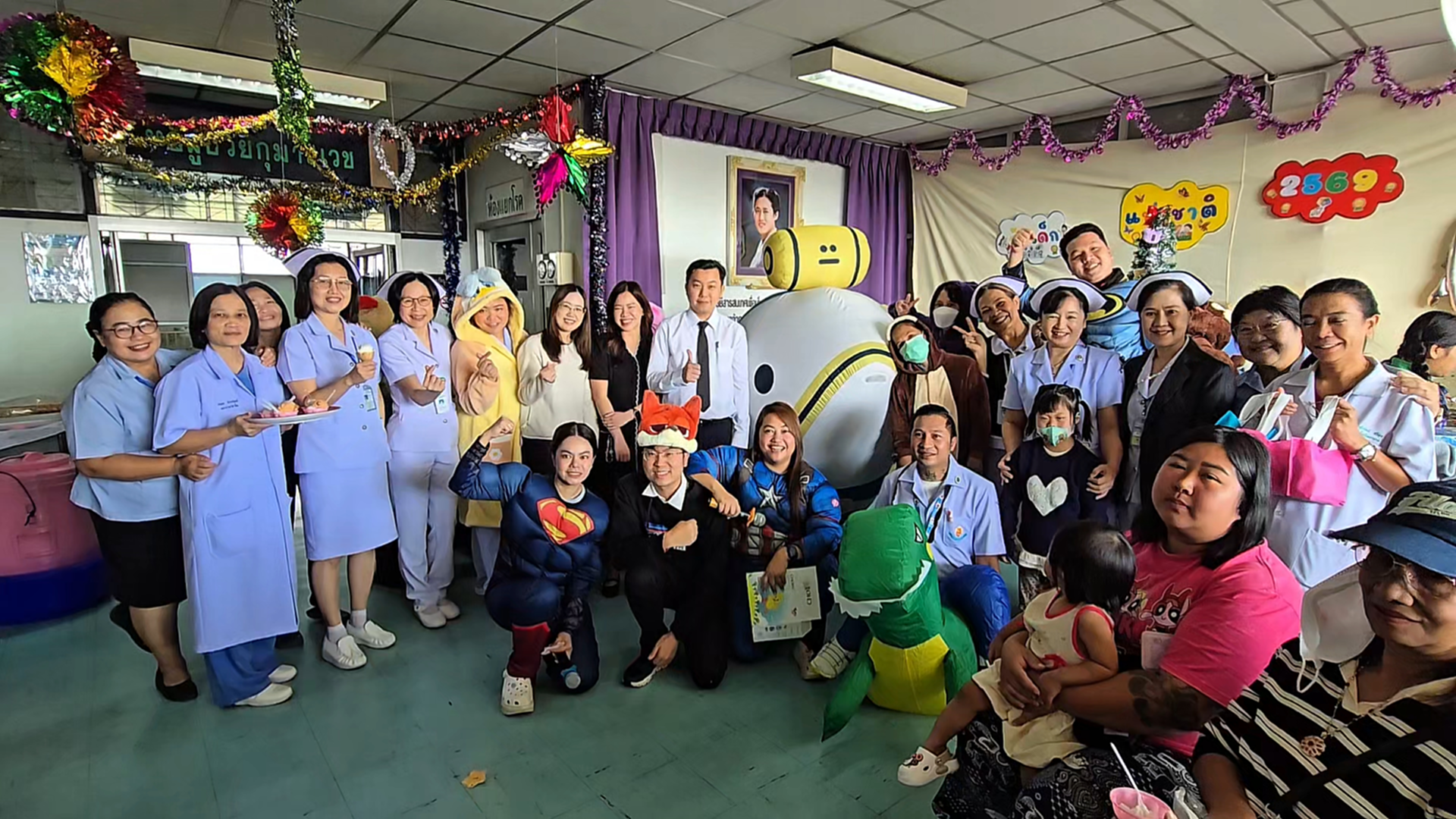 ซึ่งไม่สามารถออกไปร่วมกิจกรรมภายนอกได้ โดยบรรยากาศภายในงานเต็มไปด้วยความคึกคักและรอยยิ้ม เมื่อเหล่าคุณหมอ พยาบาล และบุคลากรทางการแพทย์ ร่วมกันสวมชุดซุปเปอร์ฮีโร่และตัวการ์ตูนขวัญใจเด็ก ๆ