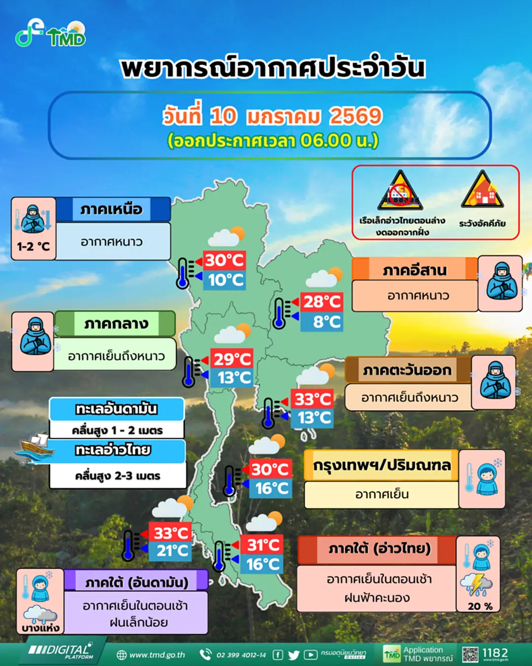 10 มกราคม 2569 ประเทศไทยตอนบนยังคงมีอากาศหนาวเย็น เนื่องจากบริเวณความกดอากาศสูงหรือมวลอากาศเย็นกำลังแรงจากประเทศจีนปกคลุมประเทศไทยตอนบน ขอให้ประชาชนดูแลรักษาสุขภาพเนื่องจากสภาพอากาศที่หนาวเย็นลง รวมทั้งให้ระวังอันตรายจากอัคคีภัยเนื่องจากสภาพอากาศแห้งและลมแรง