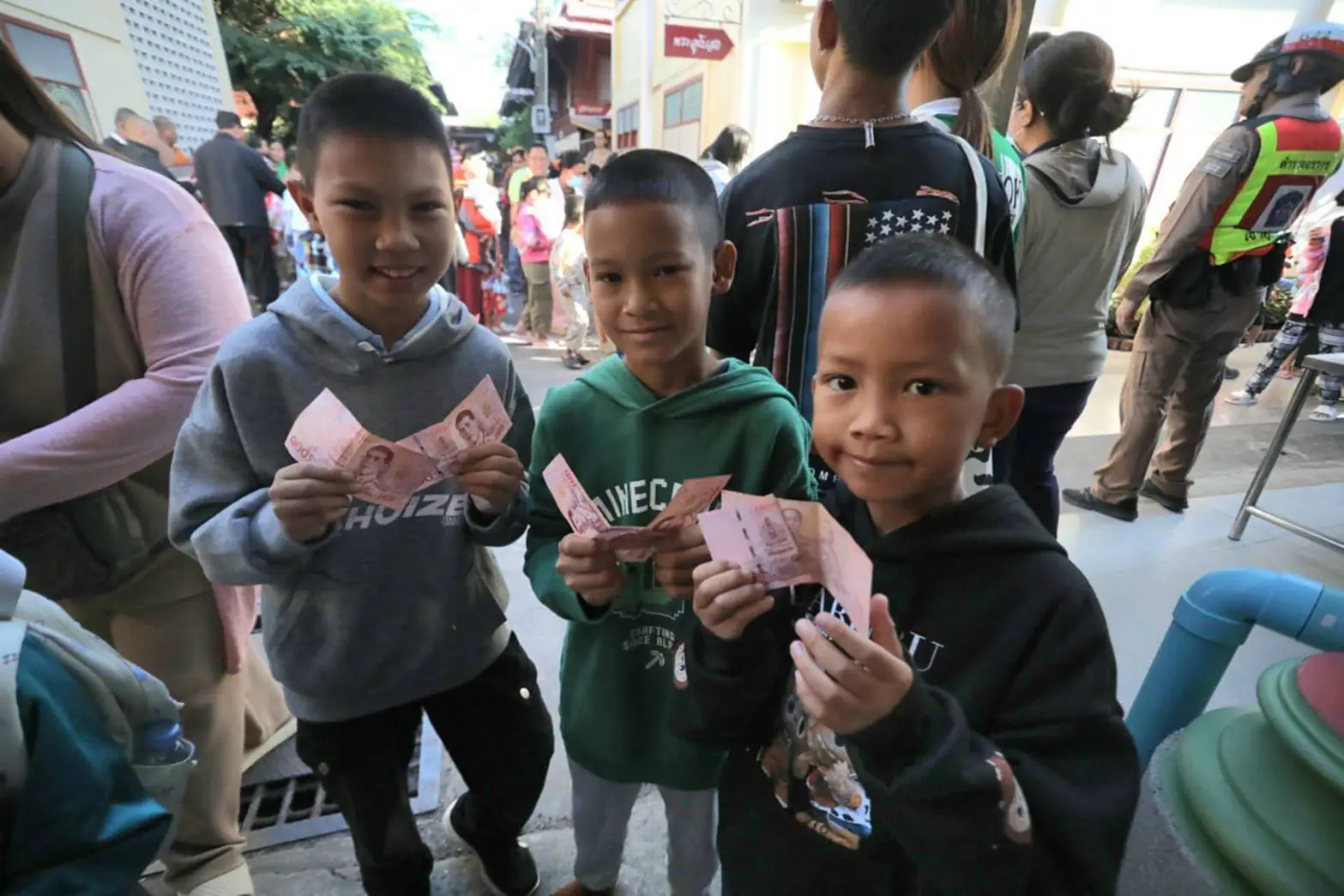 เด็กหลายคนเผยว่า เงินขวัญถุงที่ได้รับจะนำไปหยอดกระปุกออมสิน บางส่วนนำไปมอบให้พ่อแม่ ขณะที่บรรยากาศภายในวัดเต็มไปด้วยความอบอุ่นและรอยยิ้มแห่งความสุข