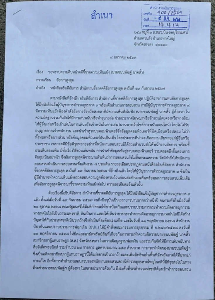 พร้อมชี้ประเด็นสอบเพิ่ม มีทั้งเรื่องวิธีชวนเล่นพนัน การนำเข้าข้อมูลเท็จสู่ระบบคอมพิวเตอร์ รวมตลอดถึงขั้นตอนการจับกุมเป็นอย่างไร ซึ่งอัยการสูงสุดพิจารณาแล้วเห็นว่าการสอบสวนยังไม่สิ้นกระแสความ จึงมีคำสั่งให้พนักงานสวนดำเนินการสอบสวนเพิ่มเติมรวม 8 ประเด็น รายละเอียดปรากฏตามหนังสืออธิบดีอัยการ สำนักงานชี้ขาดคดีอัยการสูงสุด ลงวันที่ 19 กันยายน 2567 ที่อ้างถึงแล้ว โดยให้ผู้บัญชาการตำรวจภูธรภาค 9 ซึ่งเป็นผู้มีอำนาจทำความเห็นแย้งตรวจสอบความถูกต้องครบถ้วน ก่อนส่งสำนวนคืนพร้อมผลการสอบสวนเพิ่มเติม เพื่ออัยการสูงสุดพิจารณาขี้ขาดความเห็นแย้งต่อไป