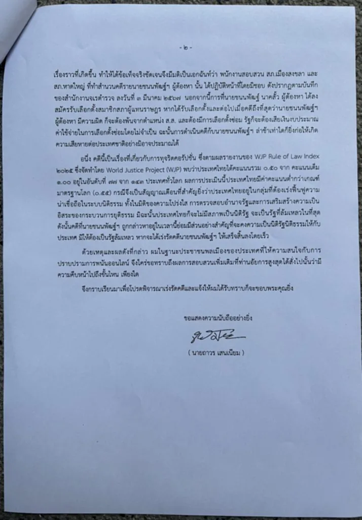 “ผมคิดว่าเรื่องนี้เป็นเรื่องใหญ่มากสำหรับการเมืองของประเทศไทย และที่สำคัญก็คือทานสเปอร์เรนซี่ international ได้สำรวจแล้วว่าการทุจริตในประเทศไทยอยู่ในลำดับที่น่าห่วงมาก และยิ่งกว่านั้นหน่วยทำการประเมินว่านิติธรรม นิติรัฐของไทยตกต่ำกว่ามาตรฐานของโลก ทั้งหลายทั้งปวงเหล่านี้เกิดจากทุจริตของเจ้าหน้าที่รัฐในกระบวนการยุติธรรม
