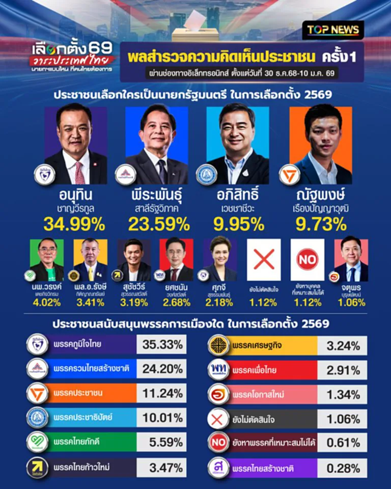 วันนี้ (11 ม.ค.69) สถานีข่าวท็อปนิวส์ เผยแพร่ผลสำรวจความคิดเห็นประชาชน จะเลือกใครเป็นนายก และจะสนับสนุนพรรคการเมืองใด ในการเลือกตั้ง 2569 ทำการสำรวจครั้งที่ ระหว่างวันที่ 30 ธันวาคม 2568 – 10 มกราคม 2569 มีกลุ่มตัวอย่างหลากหลายช่วงอายุ อายุตั้งแต่ 18 ปีขึ้นไป จนถึงไม่เกิน 79 ปี กระจายทั่วทุกภาค ระดับการศึกษาต่ำกว่าปริญญาตรี จนถึงปริญญาเอก กลุ่มอาชีพหลากหลาย ตั้งแต่ เกษตรกร ข้าราชการ เกษียณอายุราชการ เจ้าของธุรกิจ นักเรียนนักศึกษา พนักงานรัฐวิสาหกิจ พนักงานเอกชน พ่อบ้านแม่บ้าน อาชีพอิสระ และยังว่างงาน ในกลุ่มรายได้ต่อเดือน ตั้งแต่ไม่เกิน 10,000 บาทต่อเดือน จนถึงระดับ 60,000 บาทขึ้นไป สำรวจข้อมูลโดยประชาชนเข้าเว็ปไซต์ กรอกข้อมูลพื้นฐาน และกดโหวตว่าต้องการเลือกใครเป็นนายกรัฐมนตรี ต้องการเลือกพรรคการเมืองใดในการจัดตั้งรัฐบาล