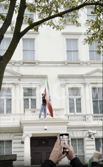 BBC และ AFP รายงานว่ากลุ่มผุ้ประท้วงหลายร้อยคนได้ไปรวมตัวกันที่หน้าสถานทูตอิหร่านประจำกรุงลอนดอนเมื่อวานนี้ (เสาร์ที่ 10 มค.) เพื่อแสดงพลังสนับสนุนการประท้วงในอิหร่านซึ่งปะทุขึ้นตั้งแต่วันที่ 28 ธันวาคม 2568 จากนั้นหนึ่งในผู้ประท้วงซึ่งเป็นชายได้ปีนขึ้นไปบนระเบียงสถานทูต ก่อนที่จะกระชากธงชาติอิหร่านออกจากเสาและฉีกทำลาย จากนั้นก็นำเอาธงชาติเก่าของอิหร่านในยุคก่อนปฏิวัติอิสลาม ซึ่งมีรูปสิงโตและดวงอาทิตย์อยู่ตรงกลางขึ้นไปแขวนแทน ท่ามกลางการเสียงโห่ร้องและตะโกนคำขวัญต่อต้านรัฐบาลอิหร่านจากด้านล่าง