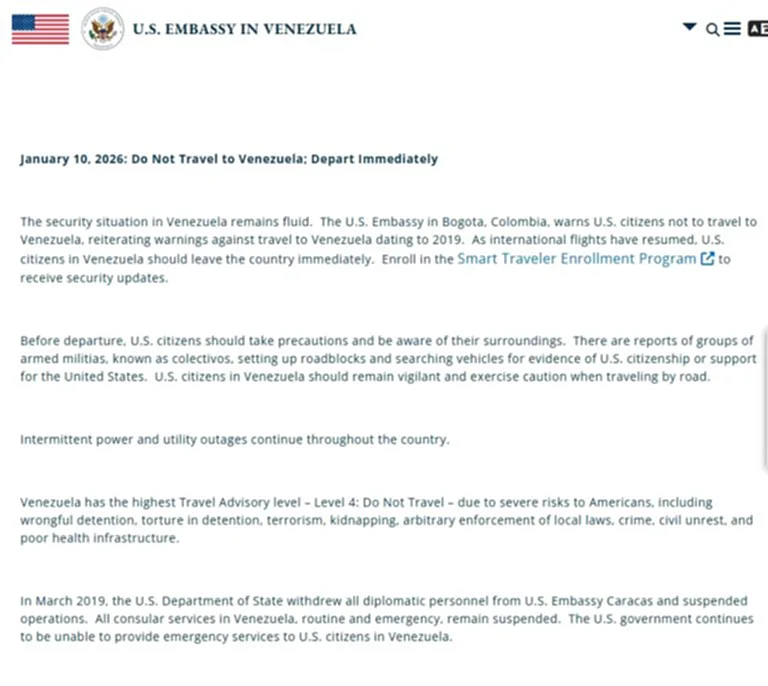 แถลงการณ์ซึ่งเป็นระดับสูงสุดหรือระดับ 4 ได้ให้เหตุผล “ด้านความเสี่ยงที่ร้ายแรง” ระบุว่ารัฐบาลเวเนซูเอล่าภายใต้การนำของประธานาธิบดีรักษาการเดลซี โรดริเกซได้มีคำสั่งให้กลุ่มติดอาวุธตั้งด่านตรวจบนถนนเพื่อหาพลเมืองชาวอเมริกัน และผู้ที่ให้การสนับสนุนสหรัฐในการโจมตีเวเนซูเอล่าเมื่อวันเสาร์ที่ผ่าน (3 มค.)