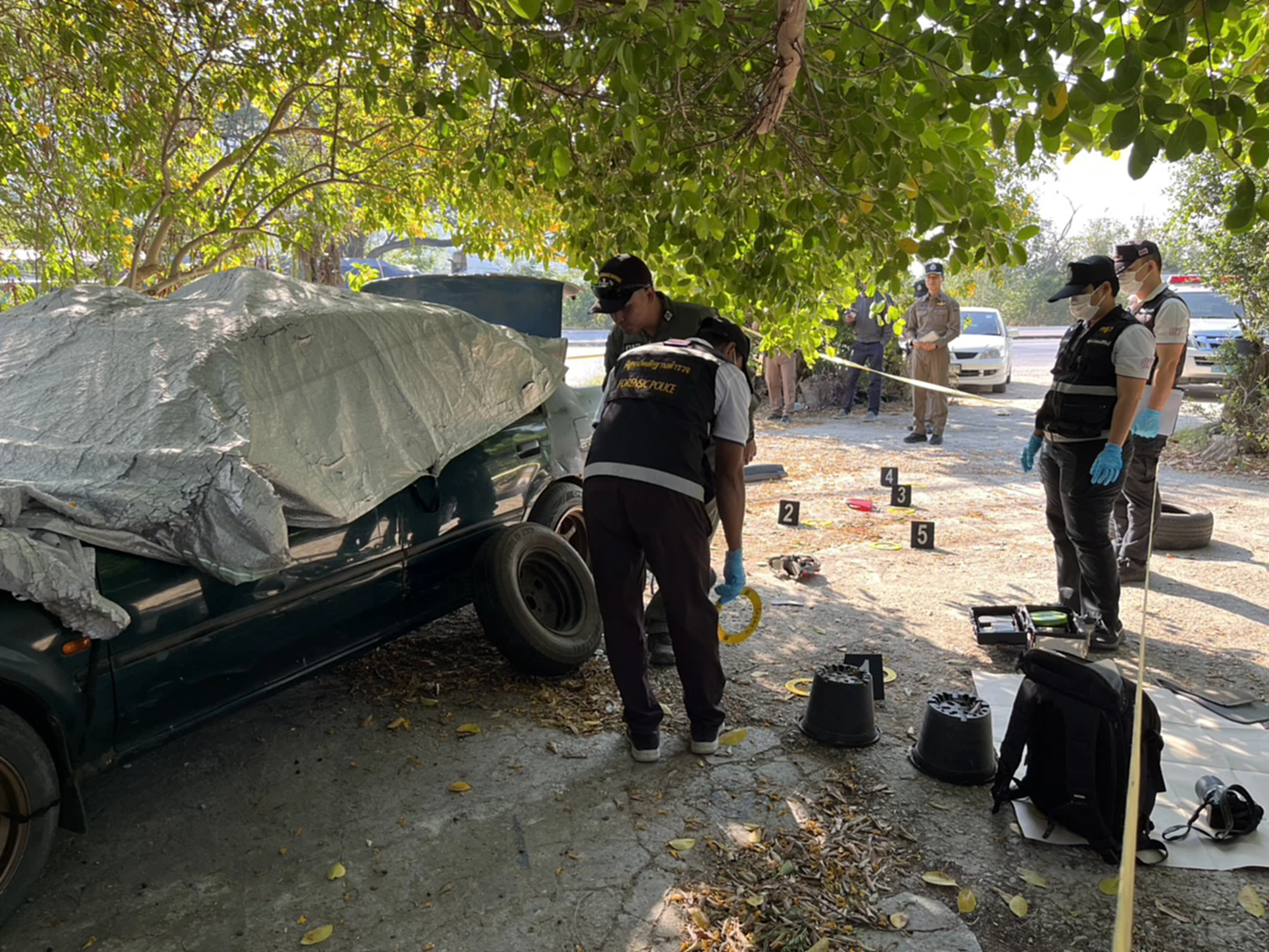 ต่อมาเมื่อเวลา 08.00 น. วันเดียวกัน เจ้าหน้าที่พิสูจน์หลักฐานเข้าตรวจสอบที่เกิดเหตุพบรถยนต์ได้รับความเสียหายและยังพบเศษตะปู หัวน๊อต กระจัดกระจายเต็มพื้น จากนั้น พ.ต.อ.เฉลิมวุฒิ วงศ์เวียงจันทร์ รอง ผบก.จ.ประจวบคีรีขันธ์ มาตรวจสอบที่เกิดเหตุ พร้อมสั่งการให้เจ้าหน้าที่ตำรวจชุดสืบสวนจังหวัด ร่วมกับ ชุดสืบ สภ.อ่าวน้อยเร่งติตตามจับกุมคนร้ายให้ได้เนื่องจากเป็นคดีอุกจกรรฉ์ ผู้บังคับบัญชาให้ความสนใจ และจากการตรวจกล้องวงจรปิดพบว่าก่อนเกิดเหตุมีคนร้าย 2 คน ใช้รถ จยย ขับวนดูบ้านเหยื่อ จากนั้นจอดรถถนนฝั่งตรงช้ามบ้านเหยื่อใช้ระเบิดไปป์บอมปาใส่และเร่งเครื่องหลบหนีไปกับความมืด