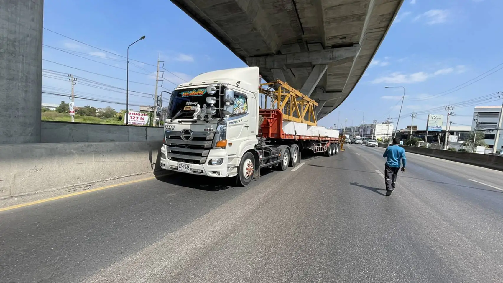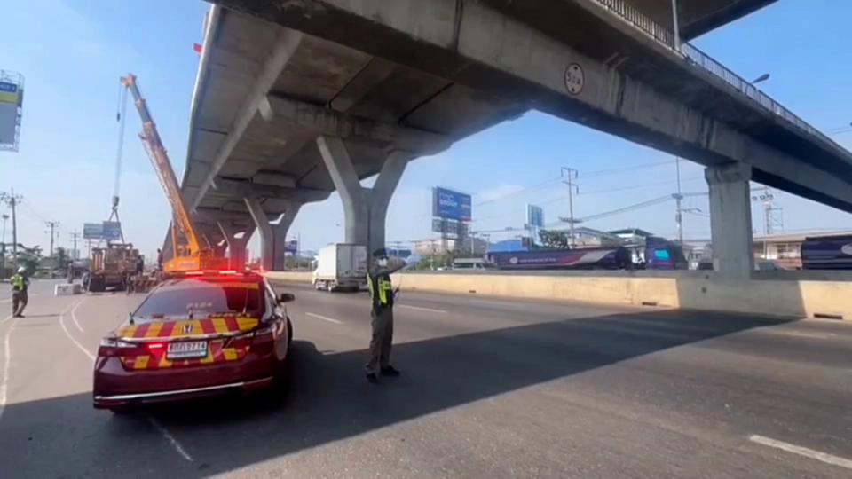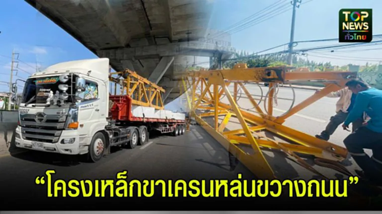 โครงเหล็กขาเครนหล่นจากท้ายบรรทุก 22 ล้อ ขวางถนนพระราม 2 คนขับอ้างสเตย์รัดมันขาด