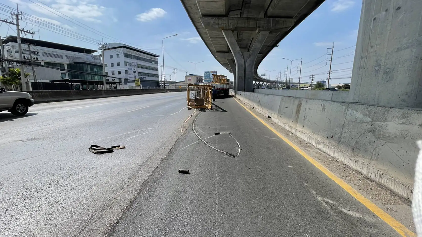 ทั้งนี้สืบเนื่องจากทางเจ้าหน้าที่ตำรวจทางหลวงของหน่วยบริการฯ ตำรวจทางหลวงมหาชัย ได้รับแจ้งสายด่วน 1193 ว่าถนนพระราม 2 ช่วง กม.17 ช่องทางหลักขาออกกรุงเทพฯ มีวัสดุตกหล่น จึงเข้าตรวจสอบ พบว่าเป็นโครงเหล็กขาเครนที่ใช้ยึดเกาะในการก่อสร้าง ตกหล่นจากรถบรรทุกกึ่งพ่วง 22 ล้อ