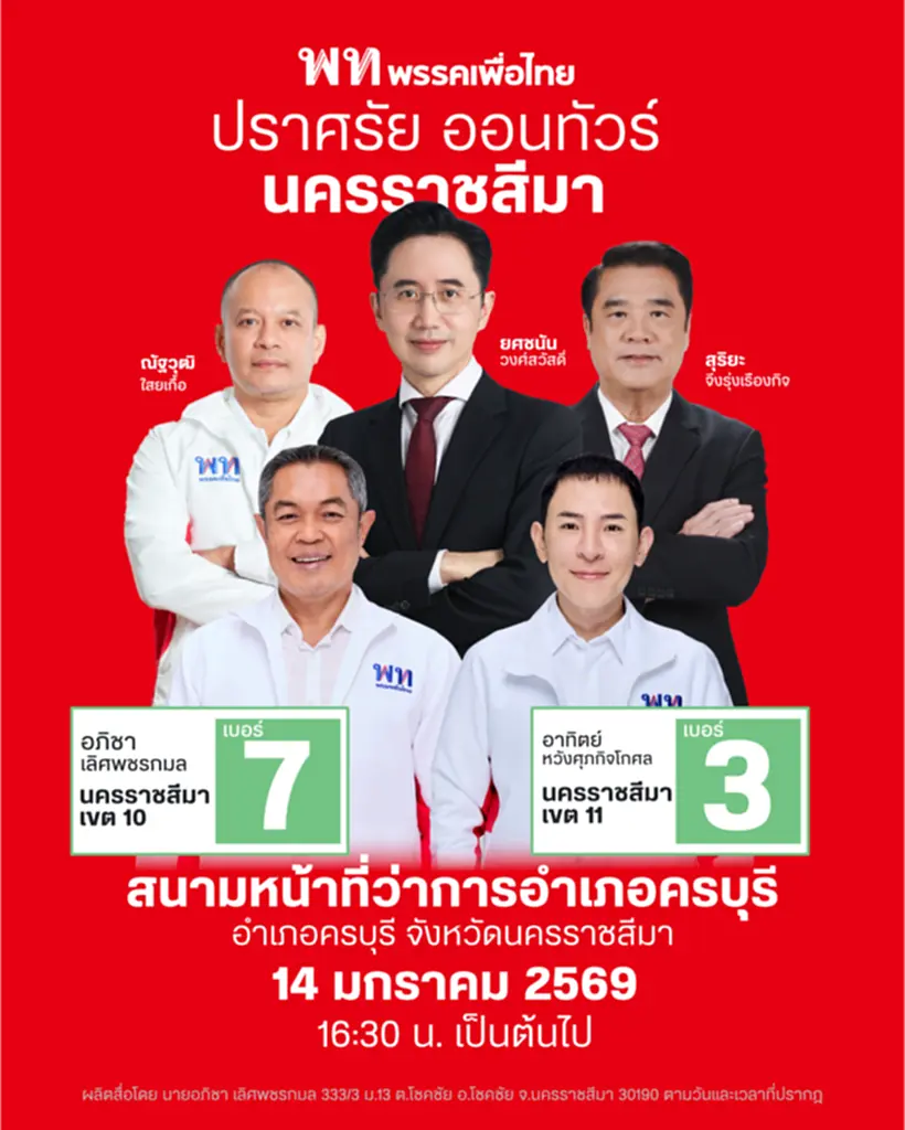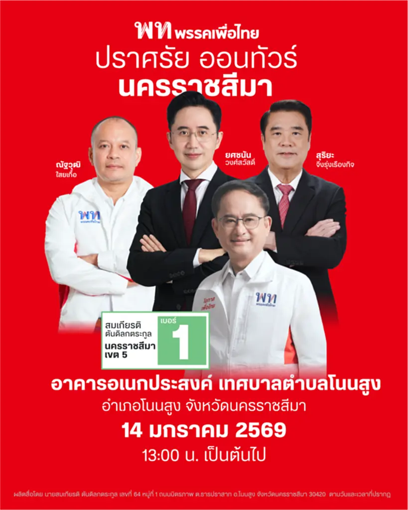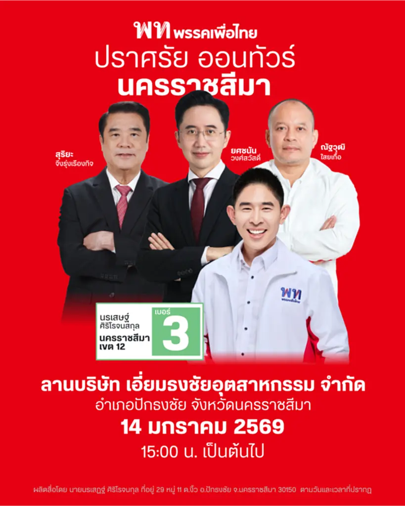 วันนี้ (12 มกราคม 2569) ผู้สื่อข่าวรายงานว่า ขณะนี้กระแสของพรรคการเมืองต่างๆ ในการเลือกตั้งที่จะมีขึ้นในอีกไม่ถึง 1 เดือนข้างหน้า ยังคงเป็นที่จับตามองในเรื่องของการครองพื้นที่เดิม และยึดพื้นที่ใหม่ โดยเฉพาะพื้นที่จังหวัดนครราชสีมา พรรคเพื่อไทยหวังพลิกประวัติศาสตร์หน้าใหม่เมืองโคราช ชนะเลือกตั้งยกทั้ง 16 เขต