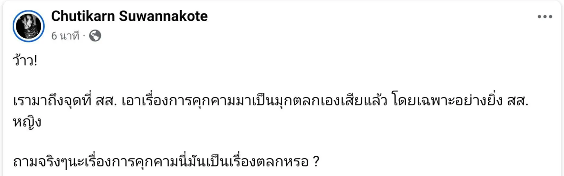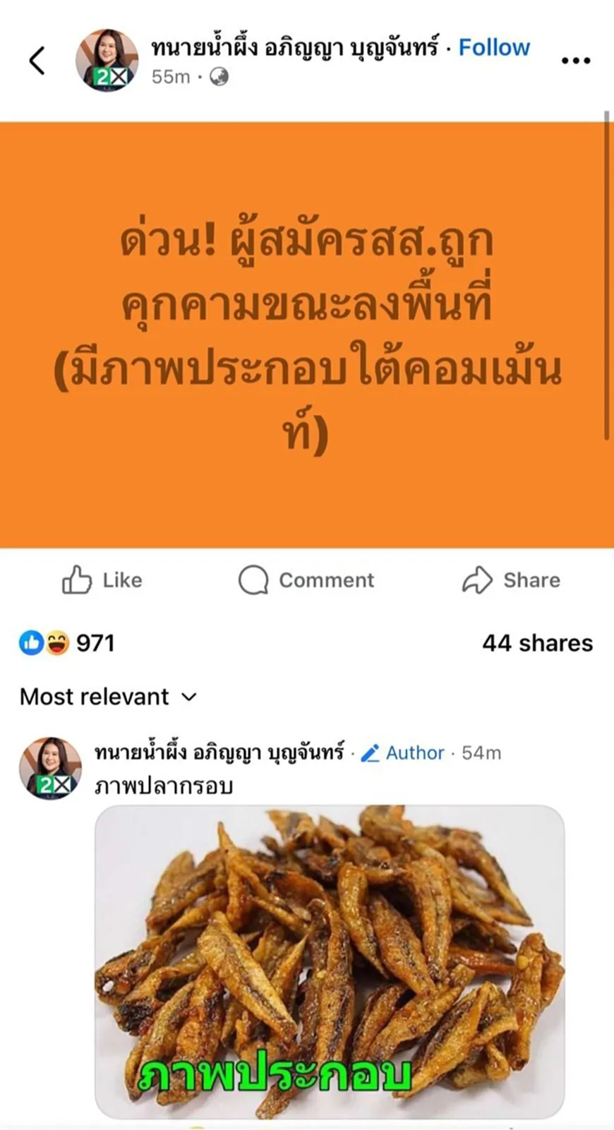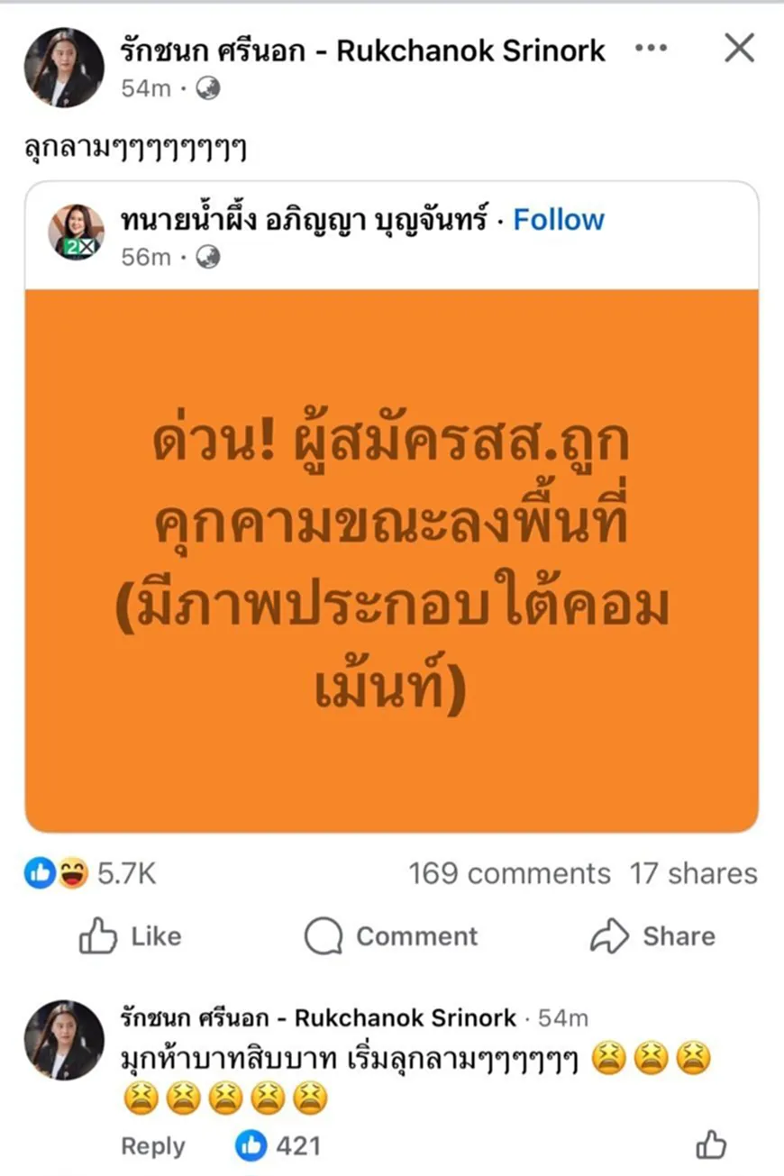 จากกรณี นางสาวอภิญญา บุญจันทร์ หรือ “ทนายน้ำผึ้ง” ผู้สมัคร สส.หนองคาย เขต 1 พรรคประชาชน (ปชน.) โพสต์เฟซบุ๊กว่า “ ด่วน! ผู้สมัคร สส.ถูกคุกคามขณะลงพื้นที่ (มีภาพประกอบใต้คอมเมนต์) และนางสาวรักชนก ศรีนอก ผู้สมัคร สส.บัญชีรายชื่อ พรรคประชาชน ได้แชร์ข้อความดังกล่าว พร้อมบอกว่า ลุกลามๆ และแสดงความคิดเห็นใต้โพสต์ของนางสาวอภิญญาว่า “มุก 5 บาท 10 บาท เริ่มลุกลามๆ”