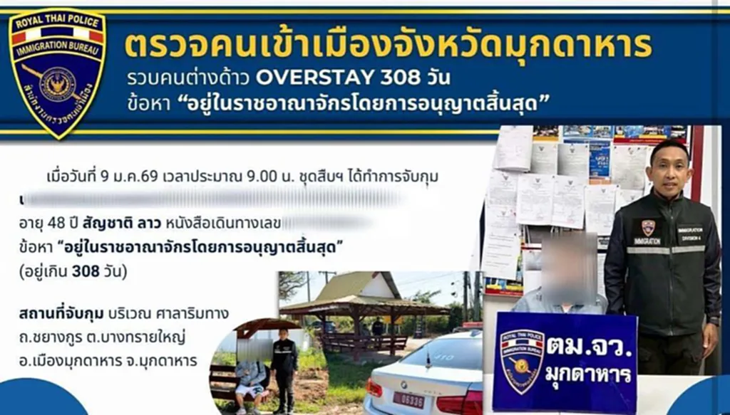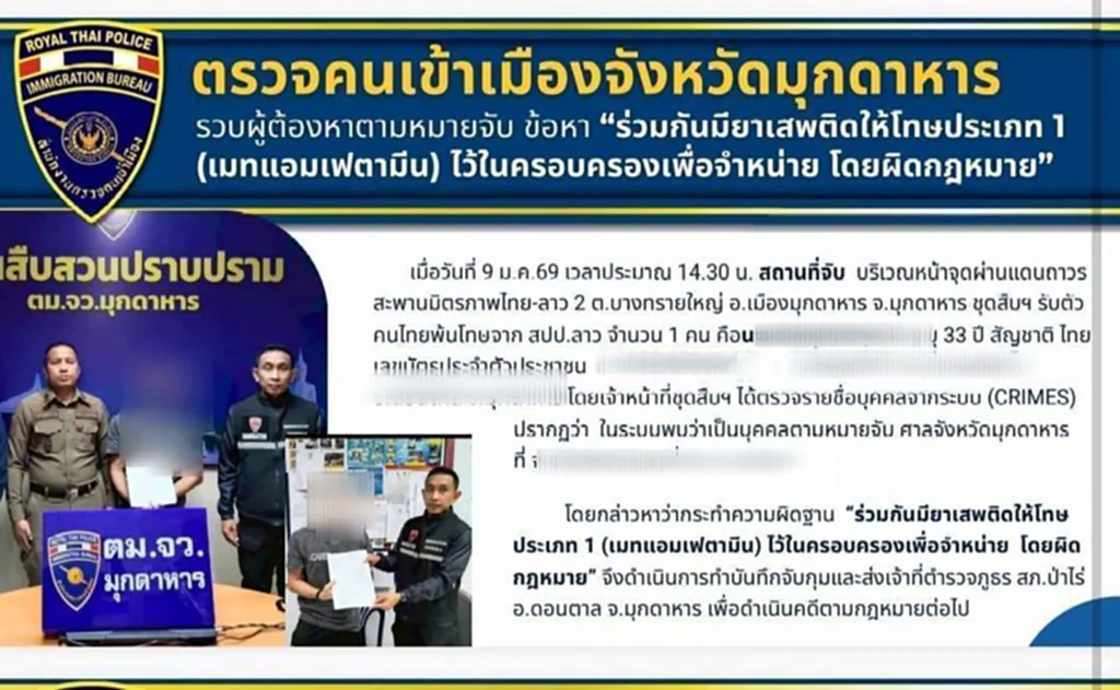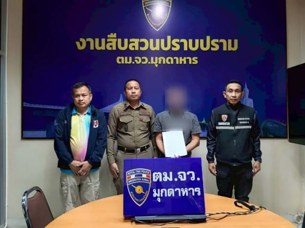 วันที่ 12 มกราคม 2569 เวลาประมาณ 10.00 น. ภายใต้อำนวยการสั่งการของ พล.ต.ต.ไพรัช พุกเจริญ ผบก.ตม.4, พ.ต.อ. กฤษฎากรณ์ กลิ่นเกสร, พ.ต.อ.มณุวัฒน์ กอสนาน รอง ผบก.ตม.4 และ พ.ต.อ.ธนิสร แสงท่านั่ง ผกก.ตม.จว.มุกดาหาร, พ.ต.ท.จตุพล ยันต์นาวา รอง ผกก.ตม.จว.มุกดาหาร และ พ.ต.ต.หญิง กัญสุชญา จีรพุทธางกูร สว.ตม.จว.มุกดาหาร โดย ร.ต.อ.ยศณรินทร์ ดอกไม้ รอง สว.ตม.จว.มุกดาหาร พร้อม เจ้าหน้าที่ชุดสืบสวนฯ ตม.จว.มุกดาหาร