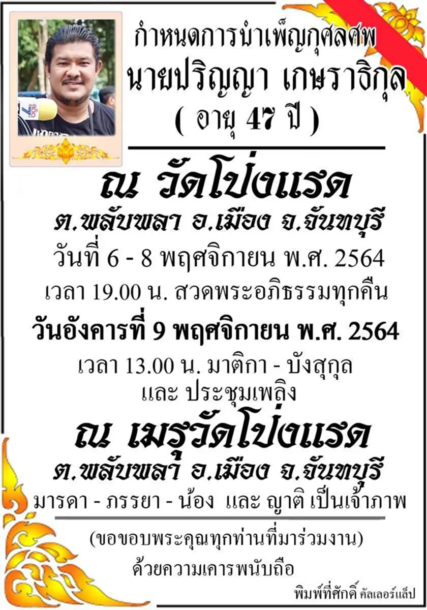 กำหนดการบำเพ็ญกุศล นายปริญญา เกษรากุล (อายุ 47 ปี) ณ วัดโป่งแรด ต.พลับพลา อ.เมือง จ.กันทบุรี วันที่ 6 – 8 พฤศจิกายน พ.ศ. 2564 เวลา 19.00 น. สวดพระอภิธรรมทุกคืน และ