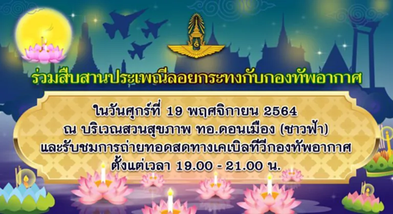 เมื่อวันที่ 19 พ.ย. ผู้สื่อข่าวรายงานว่า กองทัพอากาศได้มีการปรับรูปแบบกิจกรรมให้สอดคล้องกับมาตรการป้องกันการแพร่ระบาดของโรคติดเชื้อไวรัสโควิด-19 โดยงดการจัดกิจกรรมบนเวทีการประกวดนางนพมาศ การประกวดกระทง และการออกร้านจำหน่ายสินค้า แต่ผู้ร่วมงานยังสามารถนำกระทงมาลอยในบริเวณงานเพื่ออนุรักษ์และสืบสานประเพณีอันดีงามของไทยได้ตามปกติ ณ บริเวณสระน้ำภายในสวนสุขภาพกองทัพอากาศ ดอนเมือง (ชาวฟ้า) และบริเวณสระน้ำร้านค้าสวัสดิการกองทัพอากาศ ดอนเมือง โดยกองทัพอากาศได้จัดตกแต่งสถานที่ภายในงานอย่างสวยงาม อีกทั้งยังมีการจัดนิทรรศการ การแสดงชุดพิเศษของนักเรียนนายเรืออากาศ นักเรียนพยาบาลทหารอากาศ และนักเรียนจ่าอากาศ รวมถึงการบรรเลงดนตรีในสวน เพื่อให้ผู้ร่วมงานได้สัมผัสถึงบรรยากาศที่งดงามทรงคุณค่าของประเพณีลอยกระทง อย่างไรก็ตามกองทัพอากาศขอความร่วมมืองดเล่นพลุ ประทัด ดอกไม้ไฟ และปล่อยโคมลอยในบริเวณงาน พร้อมจัดเจ้าหน้าที่สารวัตรทหารอากาศ อำนวยความสะดวกด้านการจราจร และรักษาความปลอดภัย