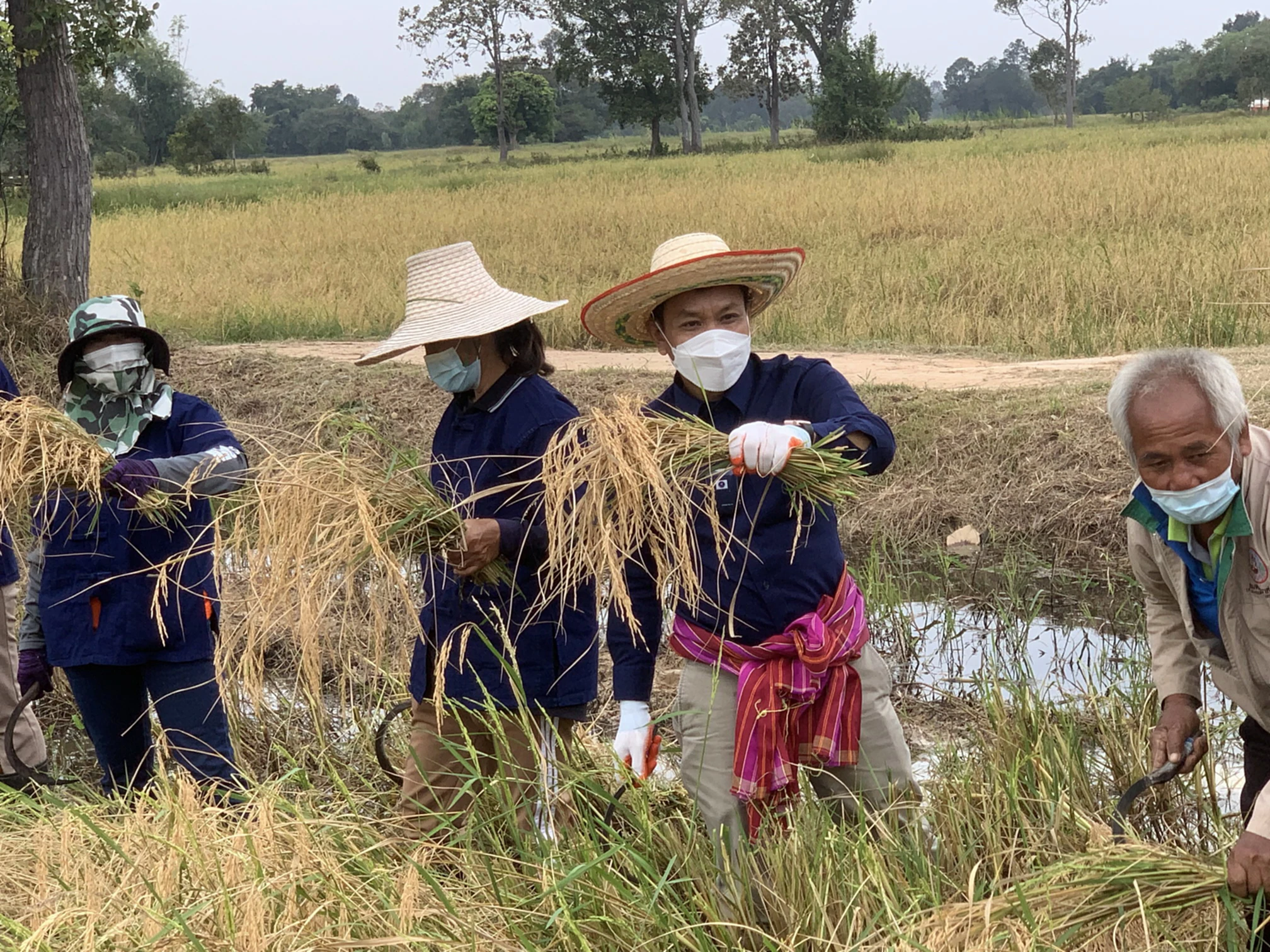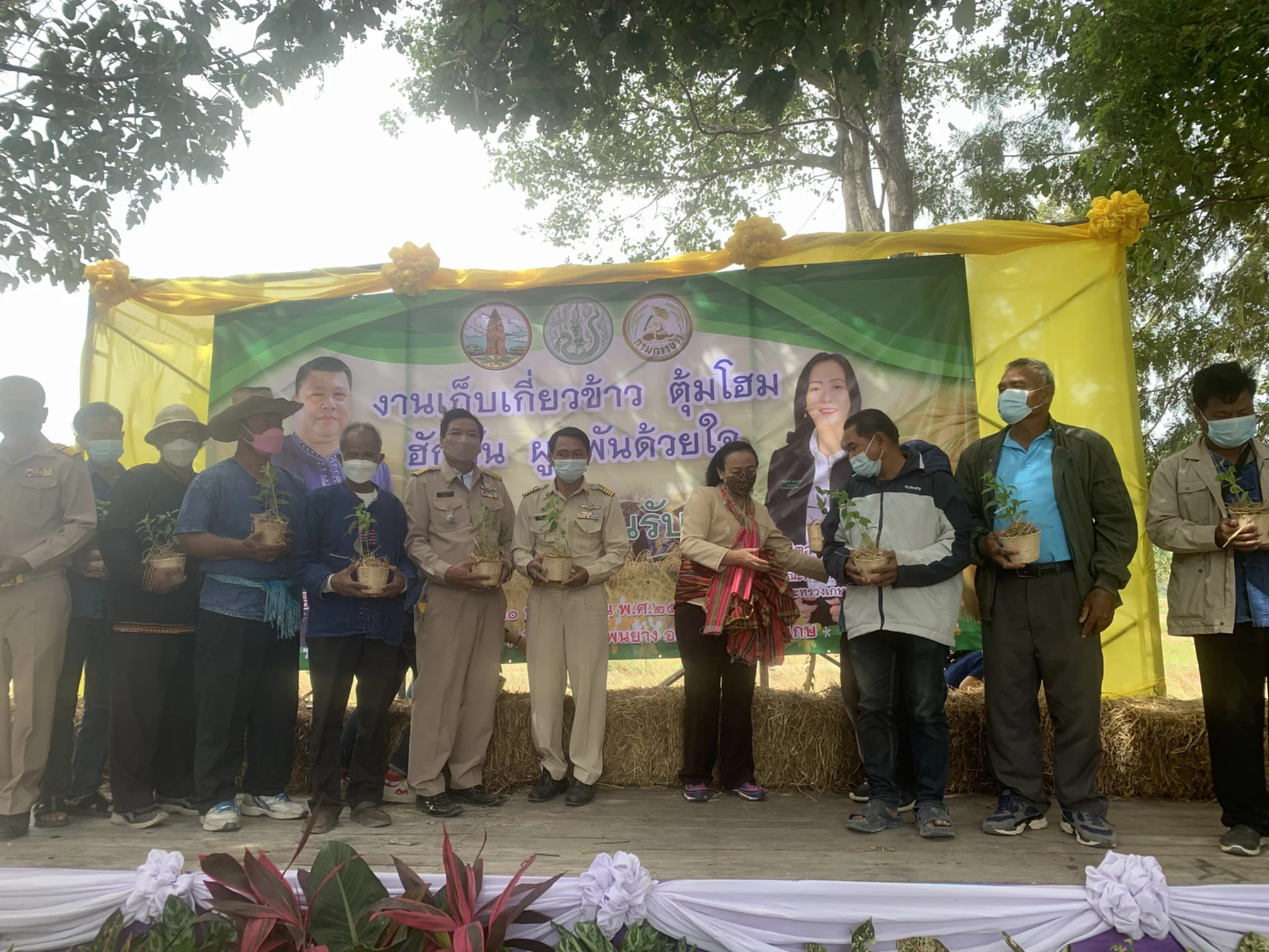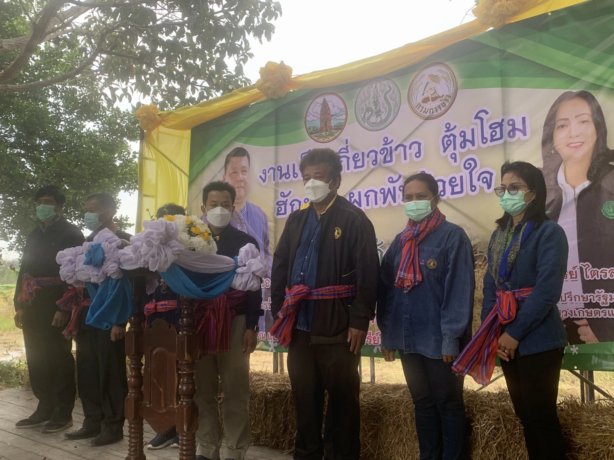 วันที่ 30 พ.ย. 2564 ผู้สื่อข่าวรายงานว่า ที่แปลงนาสาธิตข้าวอินทรีย์ บ้านโพนยาง ต.โพนยาง อ.วังหิน จ.ศรีสะเกษ นายประสงค์ ทองพันธ์ ผอ.กองตรวจสอบและรับรองมาตรฐานข้าว กรมการข้าว กระทรวงเกษตรและสหกรณ์ ได้เดินทางไปเป็นประธานลงแขกเกี่ยวข้าวและตุ้มโฮม ฮักมั่น ผูกพันด้วยใจ โดยมี นายทิวา รุ้งแก้ว ประธานคณะกรรมการประสานงานเพื่อพัฒนาจังหวัดศรีสะเกษ ผศ.ดร.ฐิตารีย์ ไตรสรณปัญญา ทีมที่ปรึกษารัฐมนตรีว่าการกระทรวงเกษตรและสหกรณ์ น.ส.ผุสดี บุญชัย ผอ.ศูนย์เมล็ดพันธุ์ข้าวศรีสะเกษ นายสมหวัง นาครินทร์ ประธานกลุ่มนาแปลงใหญ่ อ.วังหิน นำสมาชิกกลุ่มนาแปลงใหญ่ อ.วังหินจาก 13 กลุ่ม เข้าร่วมกิจกรรมลงแขกเกี่ยวข้าวและตุ้มโฮม ฮักมั่น ผูกพันด้วยใจ ในครั้งนี้เป็นจำนวนมาก ทั้งนี้เพื่อเป็นการสืบทอดวิถีชีวิตชุมชนการลงแขกเกี่ยวข้าวของชาวบ้านโพนยาง ต.โพนยาง อ.วังหิน จ.ศรีสะเกษ ต่อไป