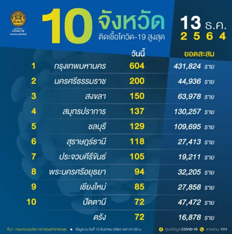 10 จังหวัดติดเชื้อโควิดสูง! ประจำวันที่ 13 ธันวาคม 2564