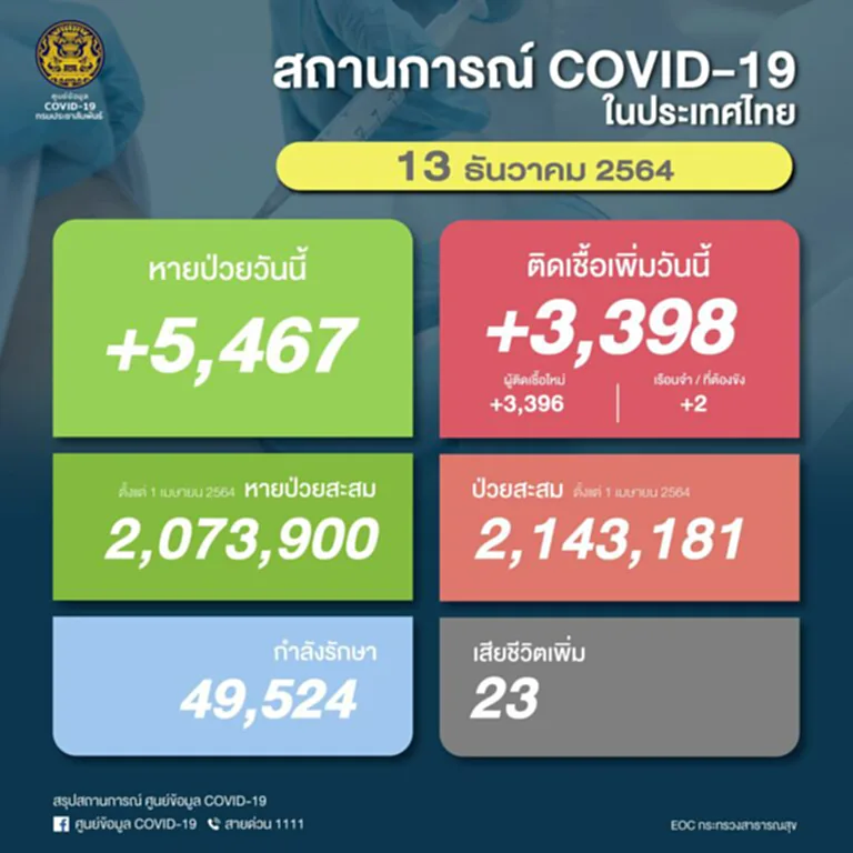 ยอดผู้ติดเชื้อโควิด-19 วันจันทร์ที่ 13 ธันวาคม 2564 รวม 3,398 ราย จำแนกเป็น ผู้ป่วยจากระบบเฝ้าระวังฯ 3,368 ราย ผู้ป่วยจากการค้นหาเชิงรุก 8 ราย ผู้ป่วยภายในเรือนจำ/ที่ต้องขัง 2 ราย ผู้ป่วยมาจากต่างประเทศ 20 ราย ผู้ป่วยสะสม 2,143,181 ราย (ตั้งแต่ 1 เมษายน) หายป่วยกลับบ้าน 5,467 ราย หายป่วยสะสม 2,073,900 ราย (ตั้งแต่ 1 เมษายน) ผู้ป่วยกำลังรักษา 49,524 ราย เสียชีวิต 23 ราย
