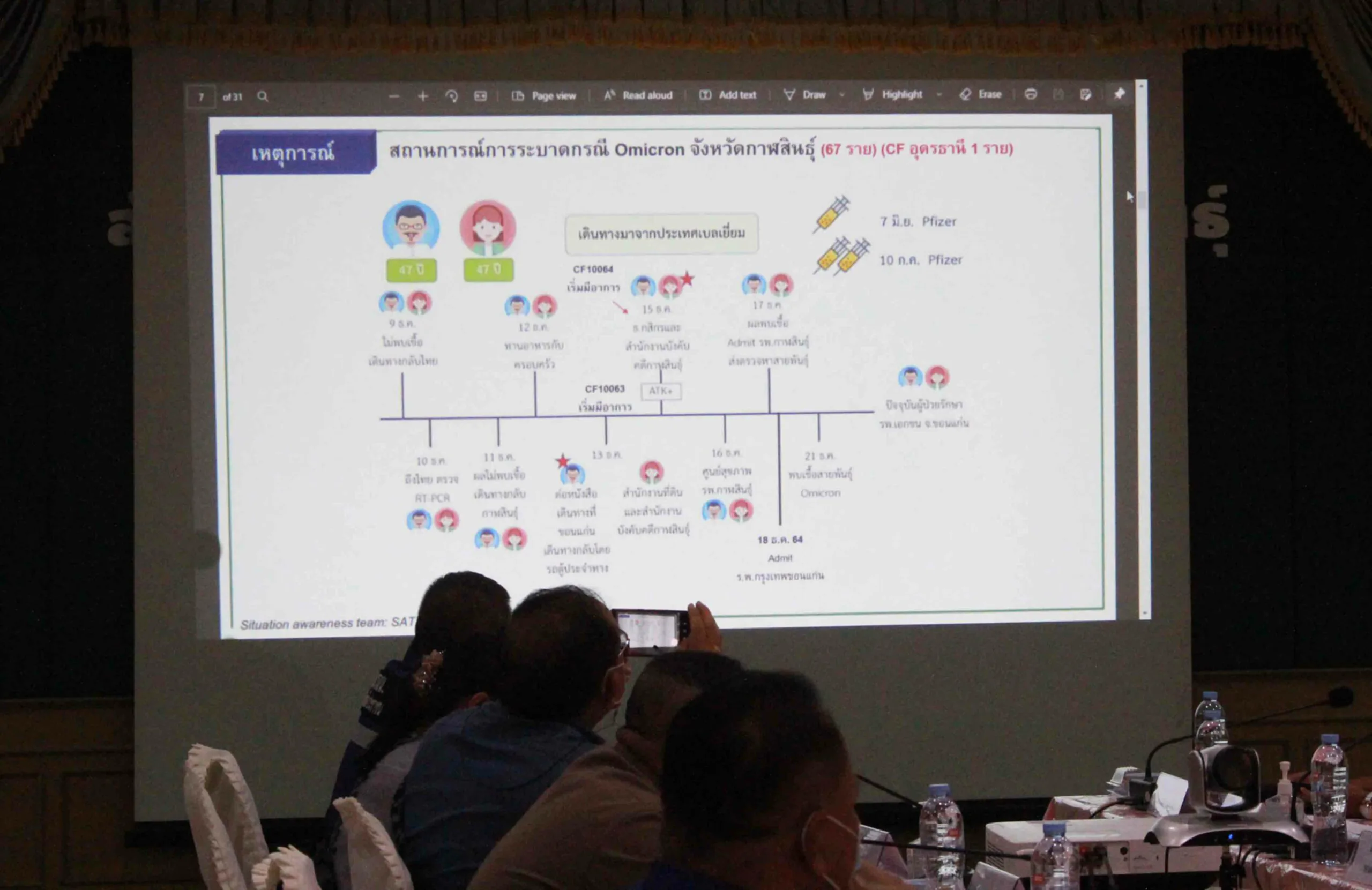 เมื่อเวลา 13.30 น.วันที่ 25 ธันวาคม 2564 ที่ห้องประชุมสำนักงานสาธารณสุข จ.กาฬสินธุ์ นายทรงพล ใจกริ่ม ผู้ว่าราชการ จ.กาฬสินธุ์ นายพิชัย ส่งสุขเลิศสันติ ปลัด จ.กาฬสินธุ์ นายแพทย์อภิชัย ลิมานนท์ นายแพทย์สาธารณสุข จ.กาฬสินธุ์ พร้อมคณะกรรมการโรคติดต่อ จ.กาฬสินธุ์ร่วมกันประชุมด่วน เพื่อติดตามสถานการณ์และกำหนดมาตาการป้องกันควบคุมการแพร่ระบาดโรคโควิด-19 สายพันธุ์โอมิครอน คลัสเตอร์สองสามีภรรยาที่กลับมาจากประเทศเบลเยียมและร้านอาหารกึ่งผับแห่งหนึ่ง ในเขตเทศบาลเมืองกาฬสินธุ์ หลังพบนักร้อง พนักงานเสิร์ฟ และลูกค้าติดเชื้อโควิด-19 สายพันธุ์โอมิครอน 19 ราย เชื่อมโยงสองสามีภรรยา และอยู่ระหว่างยืนยันสายพันธุ์อีก 45 รายและกระจายไปในหลายอำเภอ