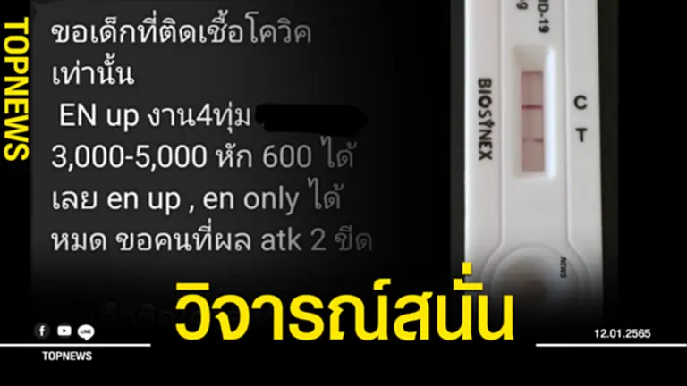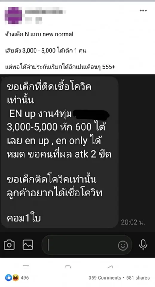 วันที่ 12 ม.ค. – เพจเฟซบุ๊ก“หมอเวร” โพสต์ข้อความระบุว่า “อะไรกันครับเนี่ย” พร้อมแนบภาพแชท จากเฟซบุ๊ก มีข้อความระบุว่า จ้างเด็กเอ็น แบบนิวนอร์มอล เสียเงิน 3,000 – 5,000 บาทได้เด็ก 1 คน แต่หากได้ค่าประกันมา จะเรียกเด็กได้อีกเป็นเดือน นอกจากนี้ในข้อความที่แชร์ ยังระบุว่า ขอเด็กที่ติดเชื้อโควิดเท่านั้น เอ็นอัพ งาน 4 ทุ่ม 3,000-5,000 บาท หัก 600 ได้เลย เอ็นอัพ เอ็นโอลี่ ได้หมด ขอคนที่ผล “ATK” 2 ขีด ขอเด็กติดโควิดเท่านั้น ลูกค้าอยากได้เชื้อโควิด”