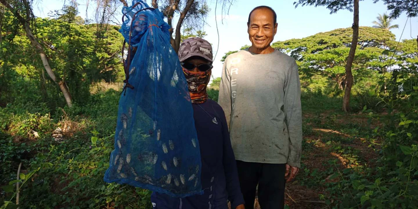 นายกล้า จำปา ชาวชุมชนเมืองใหม่ 2 ได้บอกว่า ช่วงระหว่างเดือนมีนาคม-ถึงเดือนเมษายน เข้าสู่ฤดูร้อน จักจั่นก็จะเริ่มออกมาส่งเสียงแกะตามต้นไม้และชายป่า ตนเองจึงใช้เวลาว่างออกตระเวนหาจับจักจั่น โดยใช้ไม้ไผ่ขนาดความยาว 6-7 เมตร มัดปลายไม้ด้วยตาข่าย ออกเดินตามเสียงร้องของจักจั่น ซึ่งตัวจักจั่น จะพากันเกาะตามต้นไม้ เมื่อเห็นตัวก็จะใช้ไม้ไผ่มัดปลายไม้ด้วยตาข่ายที่เตรียมมายื่นเอาปลายไปครอบตัว จักจั่น ทำให้จักจั่นไม่สามารถบินหนีไปได้ หรือใช้วิธีโบราณนำยางไม้ หรือแป้งข้าวเหนียว ติดปลายไม้ไผ่ยาว ๆ แล้วไปแหย่ตามต้นไม้ที่จักจั่นอาศัยอยู่ โดยการฟังเสียงของจักจั่นที่จะร้องดังตลอดเวลา แสดงว่ามีจักจั่นจำนวนมาก แล้วจักจั่นก็จะติดตามยางไม้ที่นำไปจับ โดยแต่ละวันสามารถจับจักจั่นได้ไม่ต่ำกว่าคนละ 100-200 ตัว แล้วแต่ว่ากำลังและความขยันของแต่ละคน บางคนจับได้มากก็จะนำมาแบ่งขายให้กับเพื่อนบ้าน ทำเงินได้วัน 200 บาท บางรายก็หาจับจักจั่น มาประกอบอาหารทาน อย่างเดียวไม่ยอมขาย เพราะถือว่าเป็นอาหารที่มีปีละครั้ง ยังเป็นการลดค่าใช้จ่ายให้ครอบครัวในช่วงโควิด-19 ได้เป็นอย่างมาก