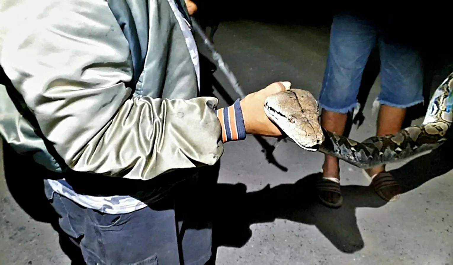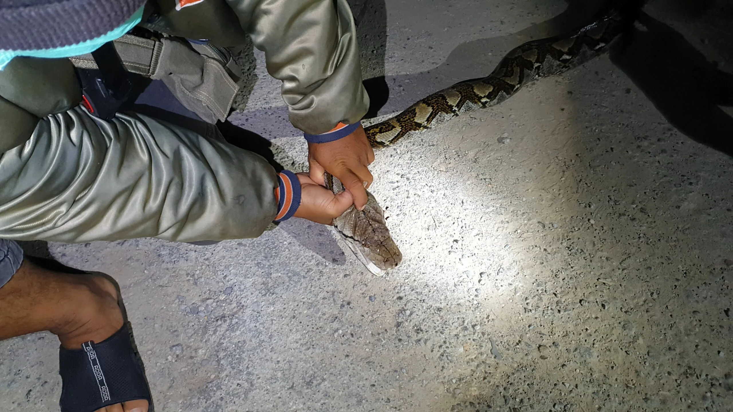 เวลา 23.00น.วันที่ 5 เมษายน 2565 นายนิรันทรัพย์ งามขำ อายุ 40 ปี อาสาสมัครตำรวจชุมชน สถานีตำรวจภูธรชะอำ จ.เพชรบุรี ได้รับแจ้งจากชาวบ้าน ว่าขอความช่วยเหลือจับงูเหลือมยักษ์ ที่นอนขวางถนน บริเวณซอยแพล้นปูนเก่าสะพานยกโรงปูนชะอำ อ.ชะอำ เนื่องจากเกรงจะไม่ปลอดภัยกับประชาชนที่ใช้รถใช้ถนนเส้นดังกล่าว จึงนำกำลังอาสาสมัครพร้อมอุปกรณ์จับงูเดินทางไปตรวจสอบ