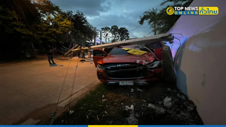 ที่เกิดเหตุพบรถยนต์กระบะยี่ห้อ อีซุซุ ดีแม็ก สีส้ม หมายเลขทะเบียน งษ 5108 ชลบุรี เสียหลักพุ่งชนเสาไฟฟ้าแรงสูง จนหักล้มพาดตัวรถ แล้วขวางถนน ทำให้สายไฟขาดห้อยระโยงระยาง เป็นระยะทางยาวกว่า 200 เมตร