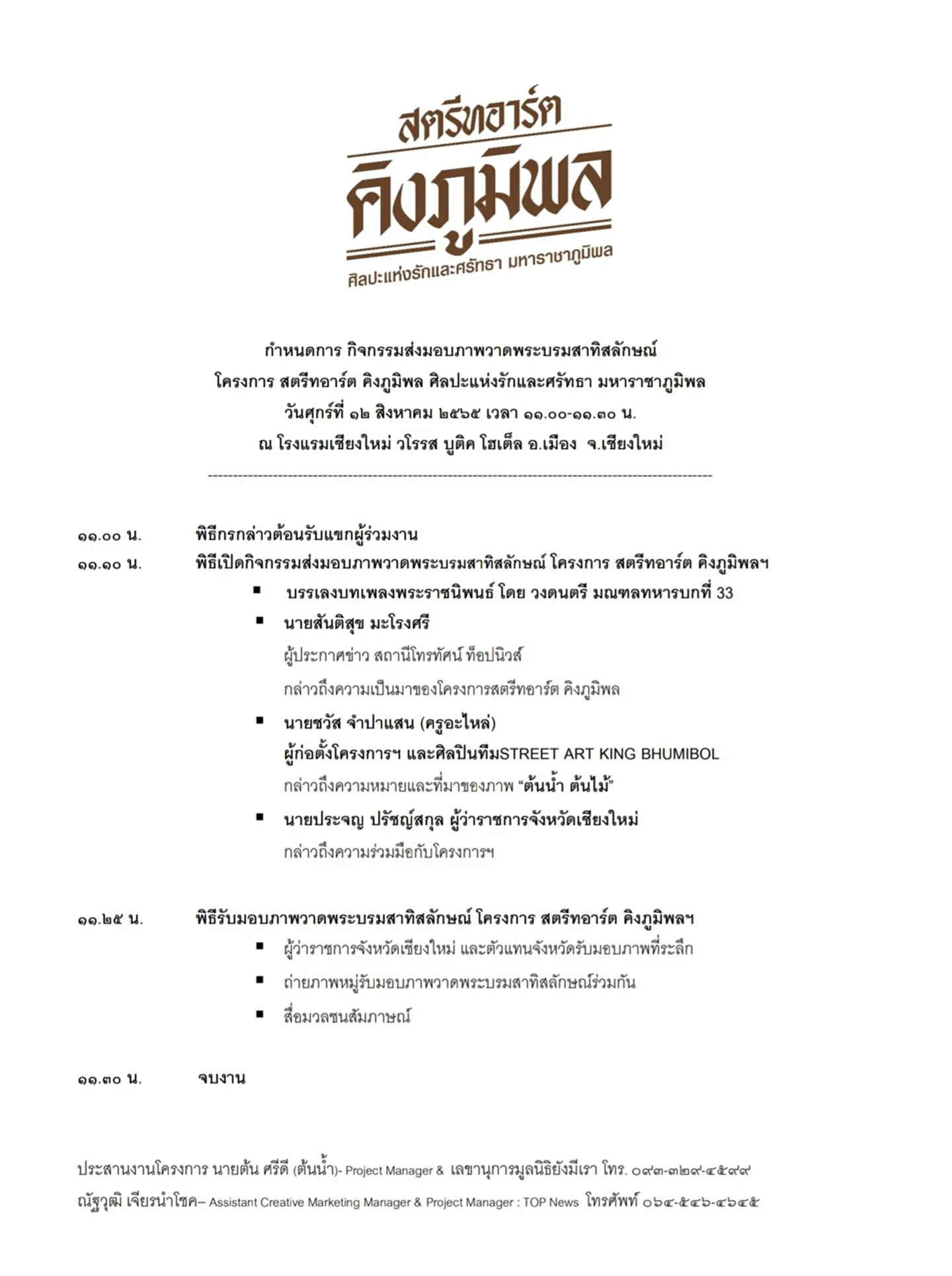 สำหรับโครงการ สตรีทอาร์ต คิงภูมิพล ครูอะไหล่ พร้อมทีมศิลปินจิตอาสา ได้ร่วมกันวาดมากแล้ว 10 ภาพในสถานที่ต่างๆ ต่อมาได้ร่วมกับ“มูลนิธิยังมีเรา” เพื่อวาดภาพต่ออีก 6 ภาพ 6 จังหวัดในปี 2565 โดยภาพแรกวาดที่ แลนด์มาร์ค พญาศรีสัตตนาคราช ริมฝั่งแม่น้ำโขง โดยได้ส่งมอบให้กับจังหวัดนครพนม ในวันที่ 28 กรกฏาคม 2565 และล่าสุดภาพที่ 2 ที่บริเวณฝาผนังข้างโรงแรมเชียงใหม่วโรรส บูติค โฮเต็ล สี่แยกถนนท้ายวัง ตำบลช้างม่อย อ.เมือง จ.เชียงใหม่ ซึ่งจะมีการส่งมอบกันในวันพรุ่งนี้ 12 สิงหาคม 2565 ส่วนในภาพต่อไปคือภาพที่สาม จะวาดที่จังหวัดอ่างทอง ท่านสามารถติดตามโครงการ “สตรีทอาร์ต คิงภูมิพล” ได้ทุกช่องทางข่าว ของ สำนักข่าวท็อปนิวส์ จะรายงานให้ทราบเป็นระยะ.