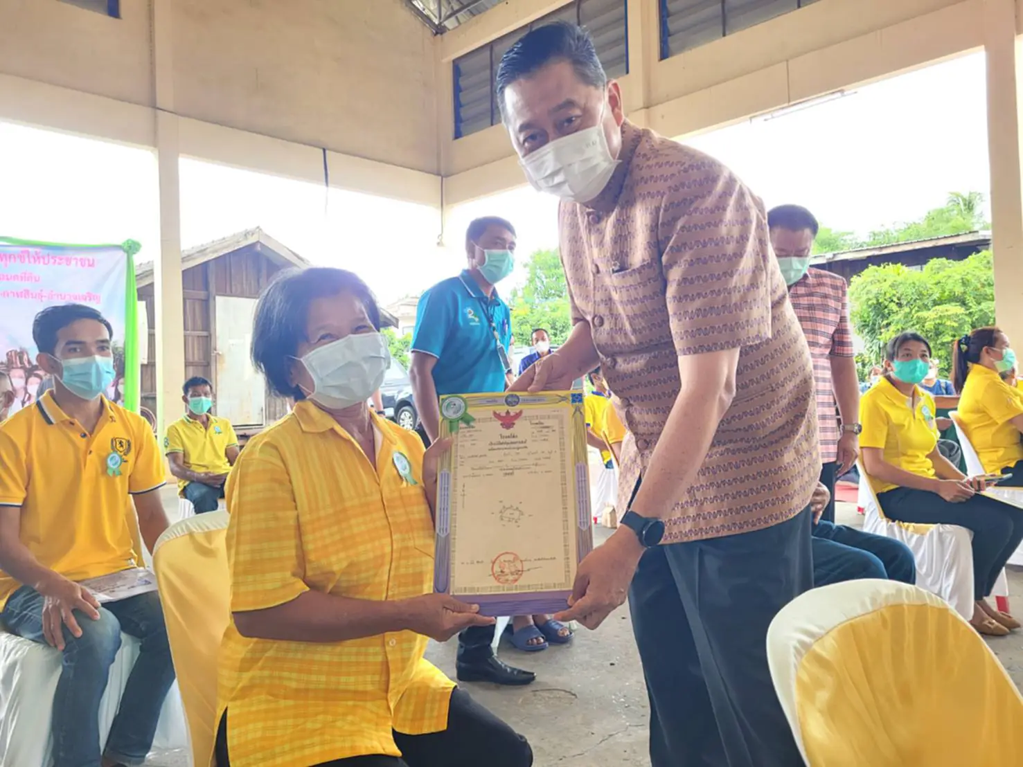วันที่ 17 สิงหาคม 2565 ผู้สื่อข่าวรายงานว่า ที่อาคารเอนกประสงค์เทศบาลตำบลโคกศรี อ.ยางตลาด จ.กาฬสินธุ์ นายทรงพล ใจกริ่ม ผวจ.กาฬสินธุ์ เป็นประธานพิธีมอบโฉนดที่ดินให้แก่ประชาชน ตามโครงการ “มอบโฉนดที่ดินทั่วไทย นำสุขคลายทุกข์ให้ประชาชน” โดยมีนายสุคนธ์ หนูภักดี ผู้ตรวจราชการกรมที่ดิน เขตตรวจราชการที่ 12 นายอิทธิพล กาฬอ่อนศรี เจ้าพนักงานที่ดิน จ.กาฬสินธุ์ นางสาวอุบลรักษ์ ศิริกุล แสบงบาล อัยการจังหวัดคุ้มครองสิทธิและช่วยเหลือทางกฎหมายและการบังคับคดี จ.กาฬสินธุ์ นายสันติ จัตุพันธ์ นายอำเภอยางตลาด พร้อมหัวหน้าส่วนราชการ ผู้นำท้องถิ่น และประชาชนในพื้นที่อำเภอยางตลาด ร่วมในพิธี