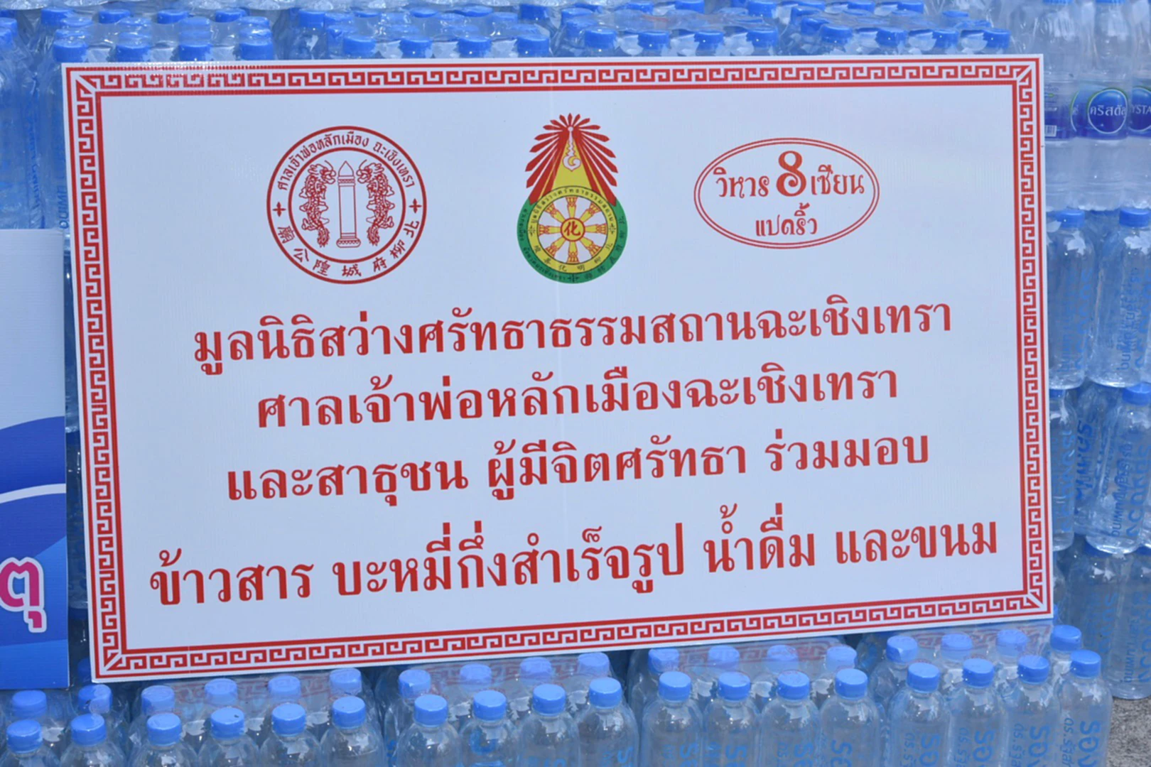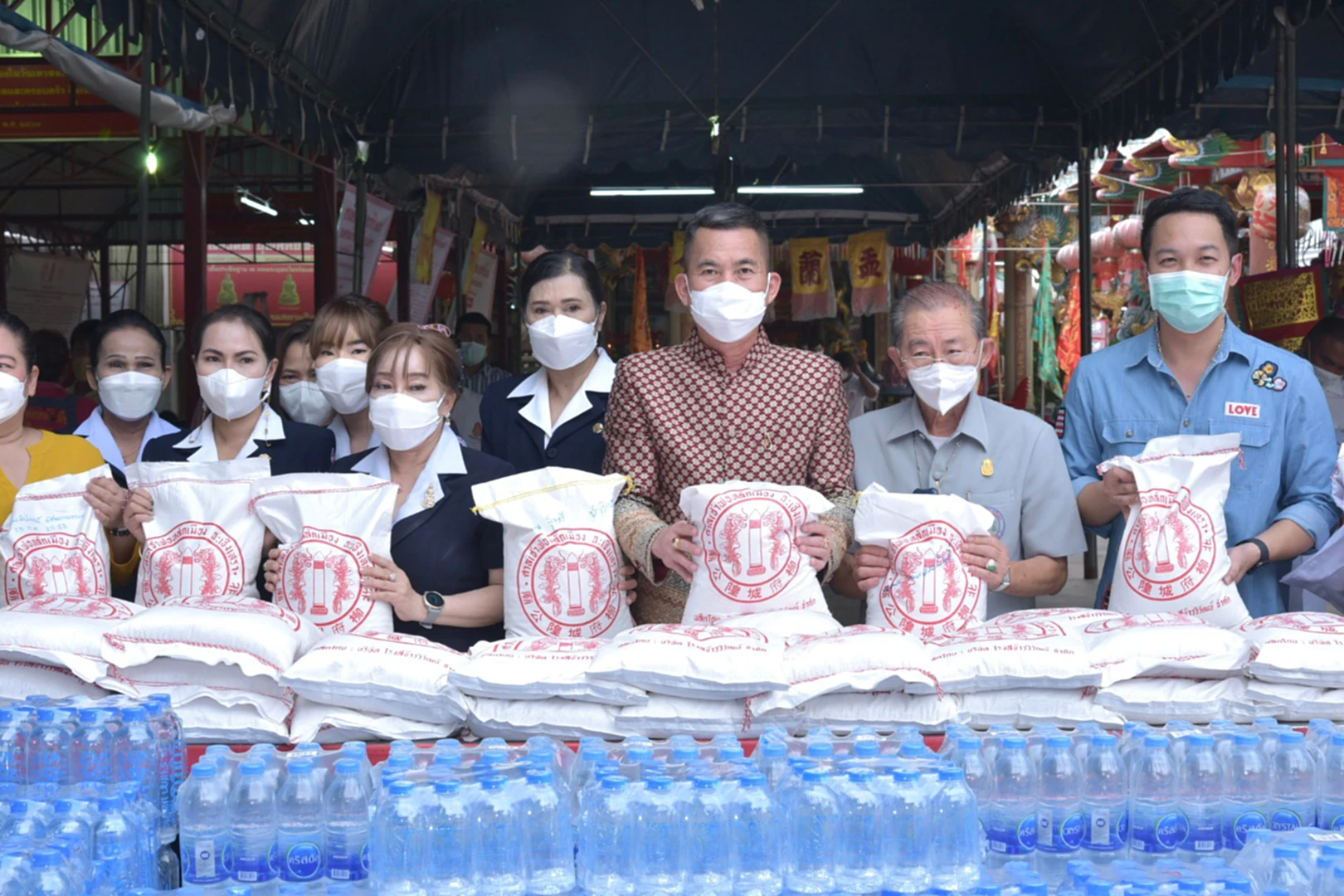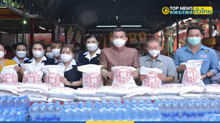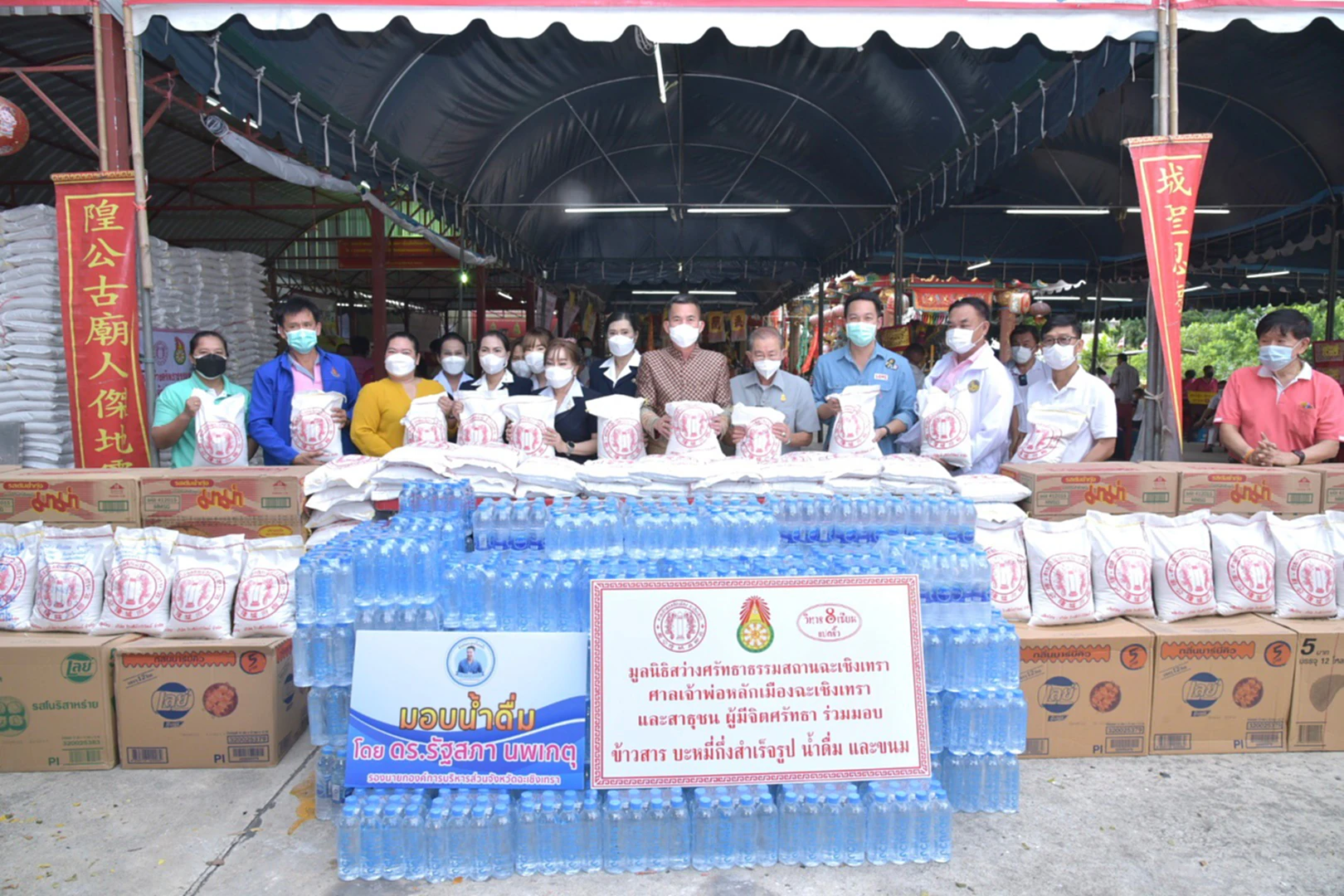 ร่วมมอบข้าวสาร ถุงละ 5 กิโลกรัม จำนวน 5,000 ถุง พร้อมบะหมี่กึ่งสำเร็จรูป ขนมและ น้ำดื่ม ให้แก่ ผู้แทนโรงเรียนและชุมชน จำนวน 13 แห่ง มารับข้าวสาร เพื่อเป็นตัวแทนของประชาชนผู้ประสบความเดือดร้อน และนำข้าวสารไปแจกจ่ายในโอกาสต่อไป ประกอบด้วย โรงเรียนเทศบาล2 พระยาศรีสุนทรโวหาร (น้อย อาจารยางกูร) /ชุมชนในเขตเทศบาล เหล่ากาชาดจังหวัดฉะเชิงเทรา/ โรงเรียนก้อนแก้วราษฎร์บำรุง/ โรงเรียนวัดประตูท่าไข่ /โรงเรียนบ้านวังตะเคียน /โรงเรียนนครเนื่องเขต /โรงเรียนฉะเชิงเทราปัญญานุกูล /ศูนย์ศึกษาพิเศษประจำจังหวัดฉะเชิงเทรา / ผู้ใหญ่มานัส โท้เป๋า หมู่ 1 ต.บางแก้ว /ผู้ใหญ่ธนเนศ รักษานนท์ หมู่ 2ต.โสธร /คุณอัจฉรา แก้วดี ประธานชมรมบันเทิงคนแปดริ้ว และวัดโพนงาม อ.สนามชัยเขต