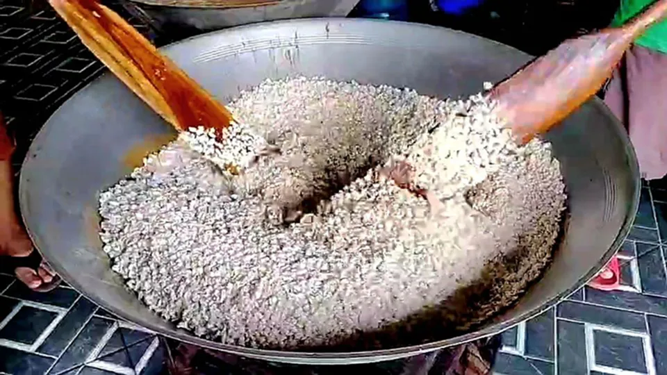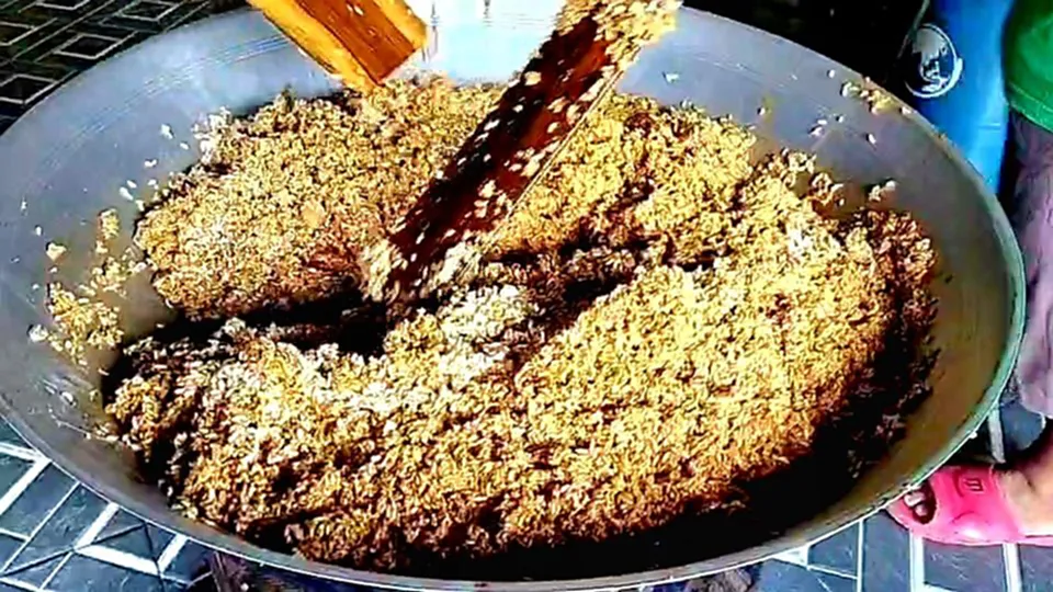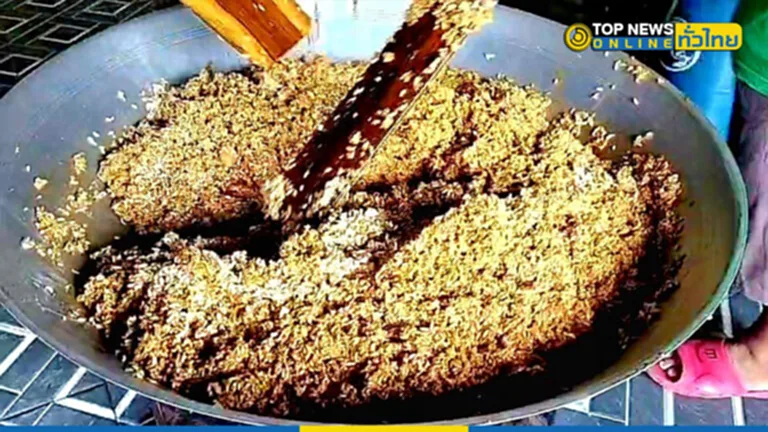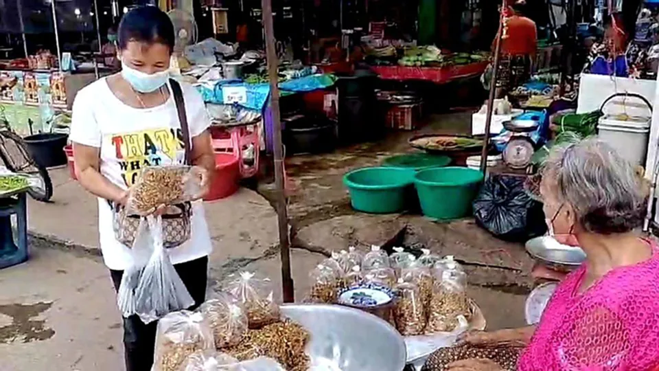 นางคนึงนิจ ประสมโสม อายุ 54 ปี ลูกสาวคุณยาย เล่าว่า ตนกับและครอบครัวซึ่งช่วยกันทำขนมกระยาสารทมานานกว่า 50 ปีแล้ว โดยได้สูตรมาจากคุณตาคุณยายและรุ่นแม่ จนมาถึงรุ่นตนทุกวันนี้ โดยช่วยกันทำ 3 คนพี่น้อง ช่วยกันกวน และนำไปขายช่วยกันตามตลาดในเขตกบินทร์บุรี ขายที่ตลาดเม่งหลี และตลาดกบินทร์บุรีในช่วงเช้า 05.00 น. – 12.00 น. ของทุกวัน และเสาร์อาทิตย์ 13.00 น. – 19.00 น. จะมาขายที่ตลาดทิพย์ท็อปกบินทร์บุรี ส่วนวันพุธก็จะขายอยู่ที่ตลาด ในช่วงนี้ใกล้เทศกาลสารทไทยและสารลาว ราคาเริ่มที่ 160 บาท/กิโลกรัม