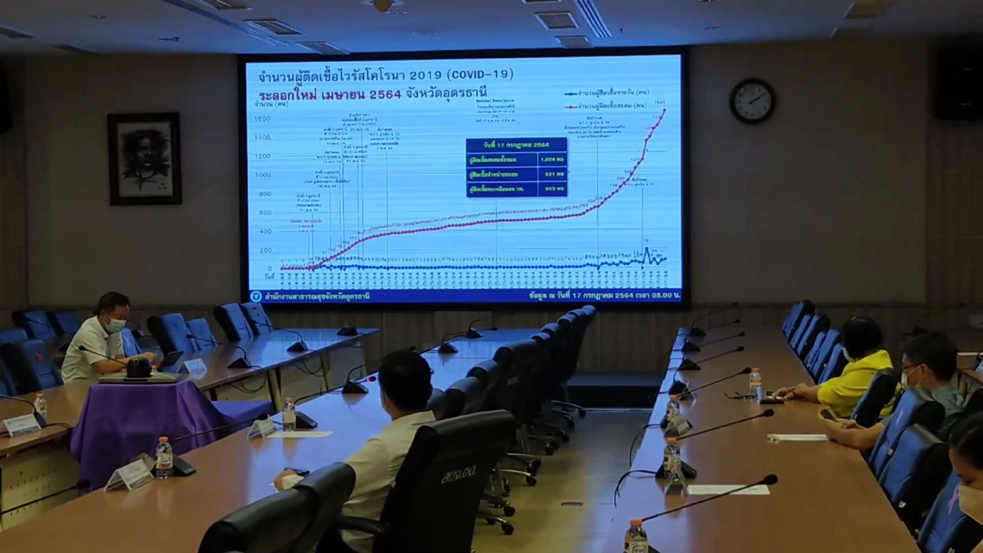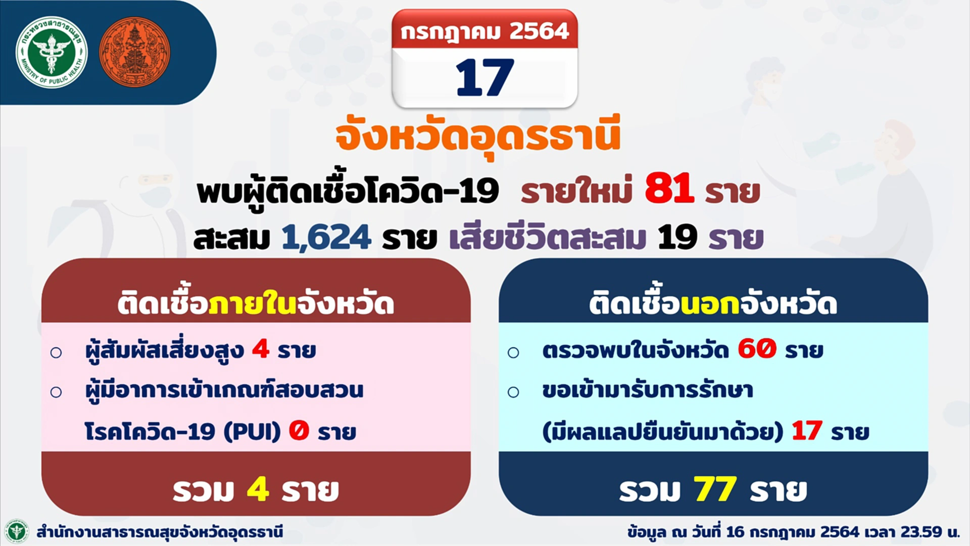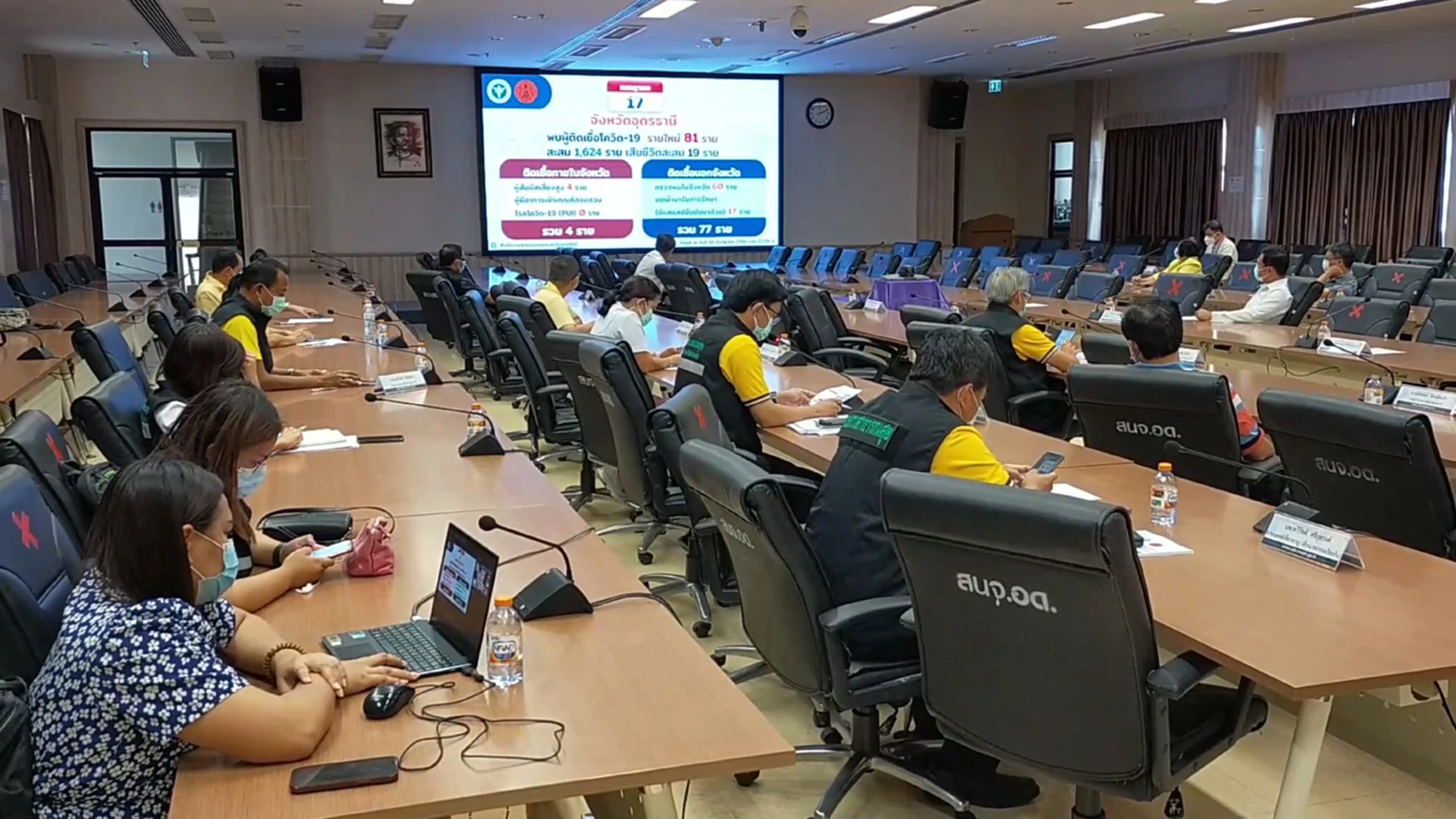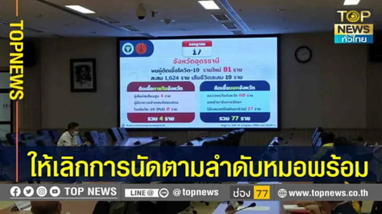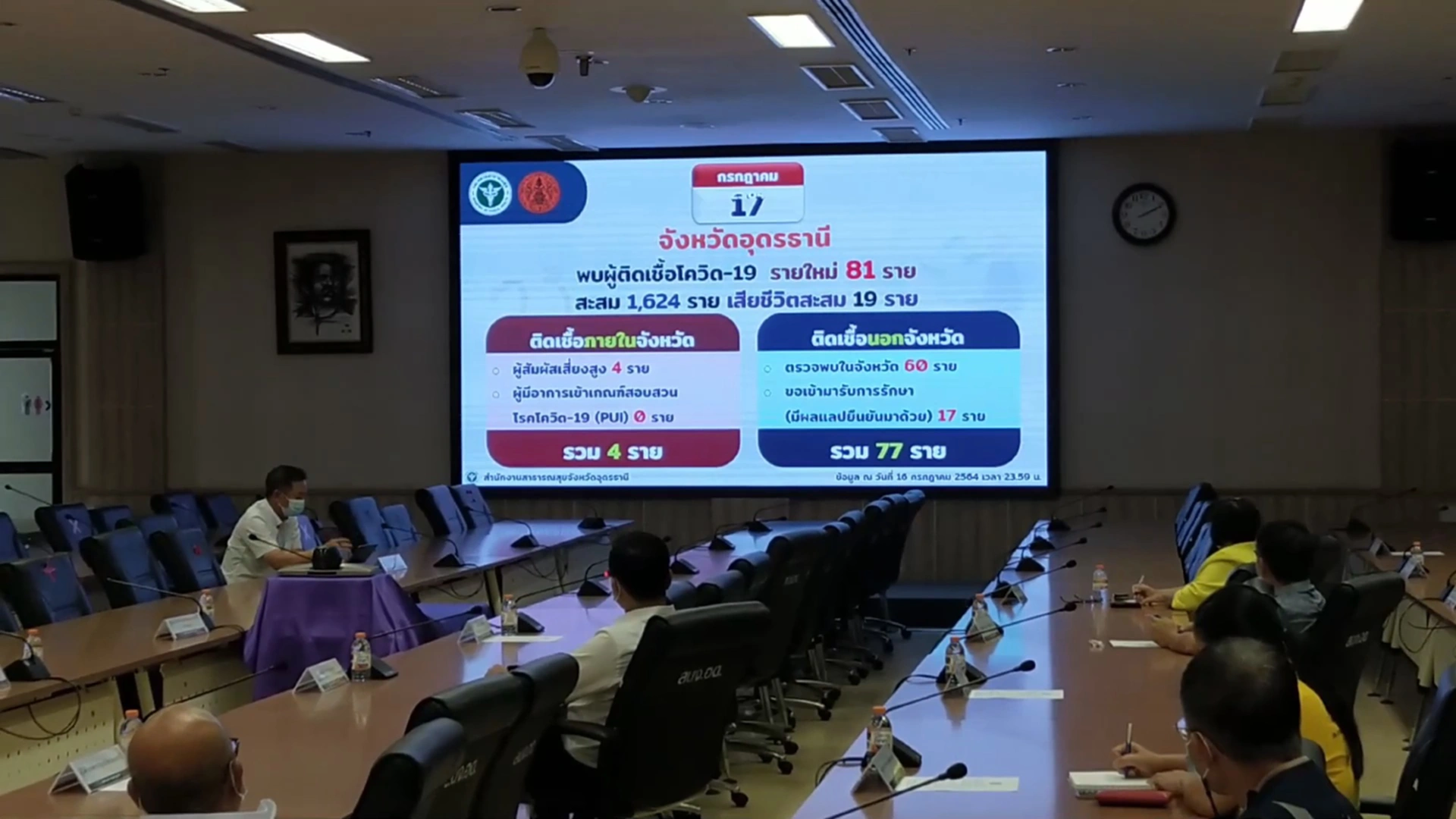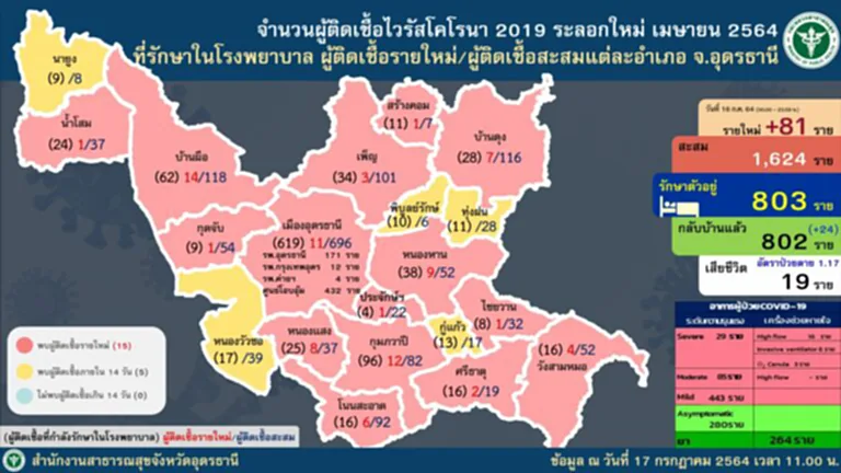 ในที่ประชุมรายงานว่า อุดรธานีพบผู้ติดเชื้อและผู้ป่วยเพิ่ม 81 ราย เป็นผู้เดินทางมาจาก กทม.-ปริมณฑล 77 ราย ยืนยันการติดเชื้อตรวจมาจาก กทม.17 ราย ติดเชื้อจากผู้สัมผัสเสี่ยงสูงในพื้นที่ 4 ราย ทำให้ผู้ติดเชื้อสะสม 1,624 ราย หายกลับบ้าน 802 ราย และรักษาตัวอยู่ 803 ราย ไม่มีผู้เสียชีวิตเพิ่ม สะสมอยู่ที่ 19 ราย โดยในวันพรุ่งนี้โครงการ “นำลูกหลานชาวอุดรกลับบ้าน” จะมีการเดินทางกลับมา 125 ราย เป็นผู้ยืนยันติดเชื้อ 63 ราย ผู้ยังไม่ได้รับการตรวจเชื้อ 62 ราย จำนวนนี้มีไข้ 12 ราย